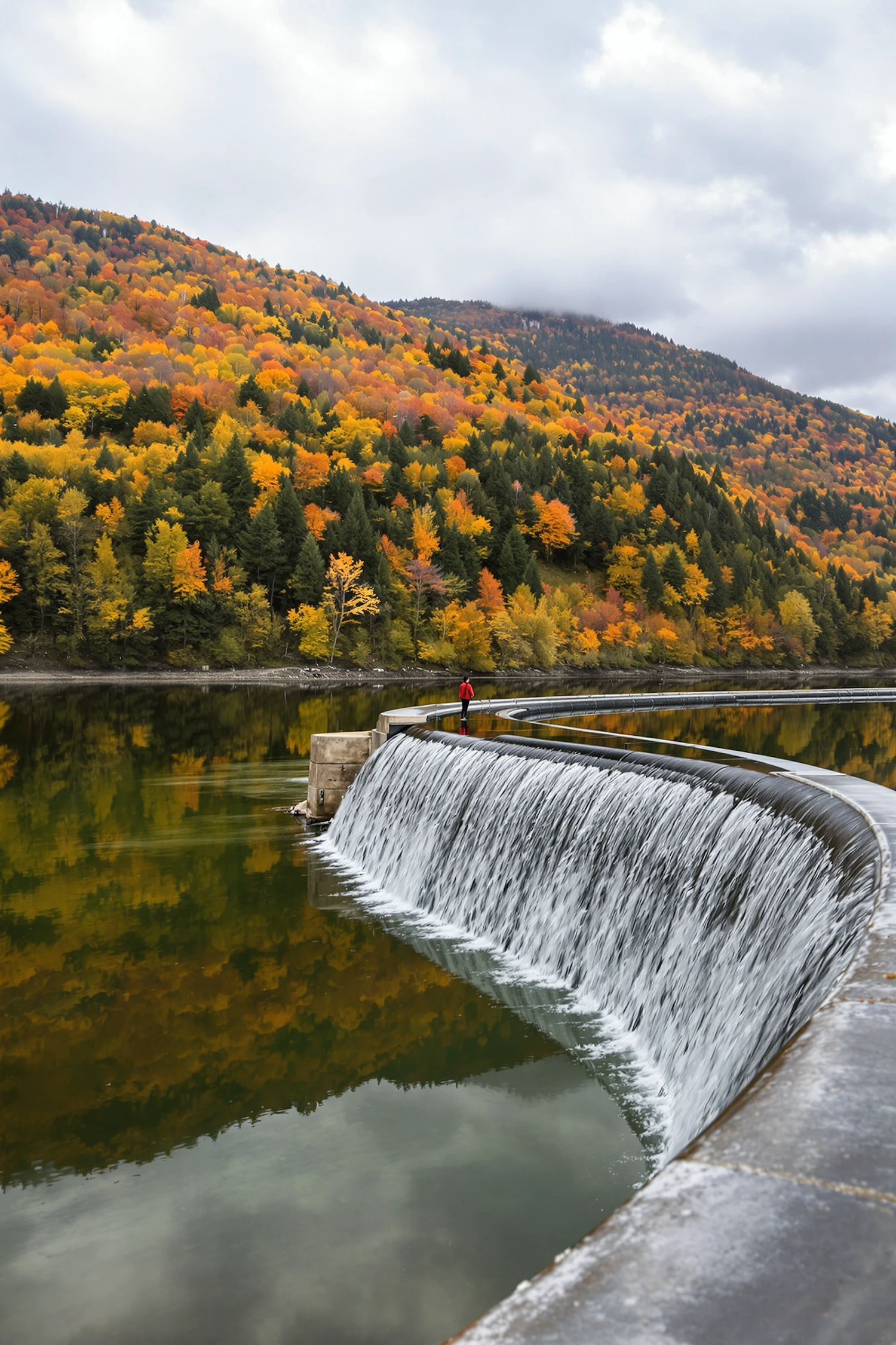 Autumn landscape with vibrant foliage, a curved dam, and cascading water. A person in a red jacket adds scale to the serene scene.