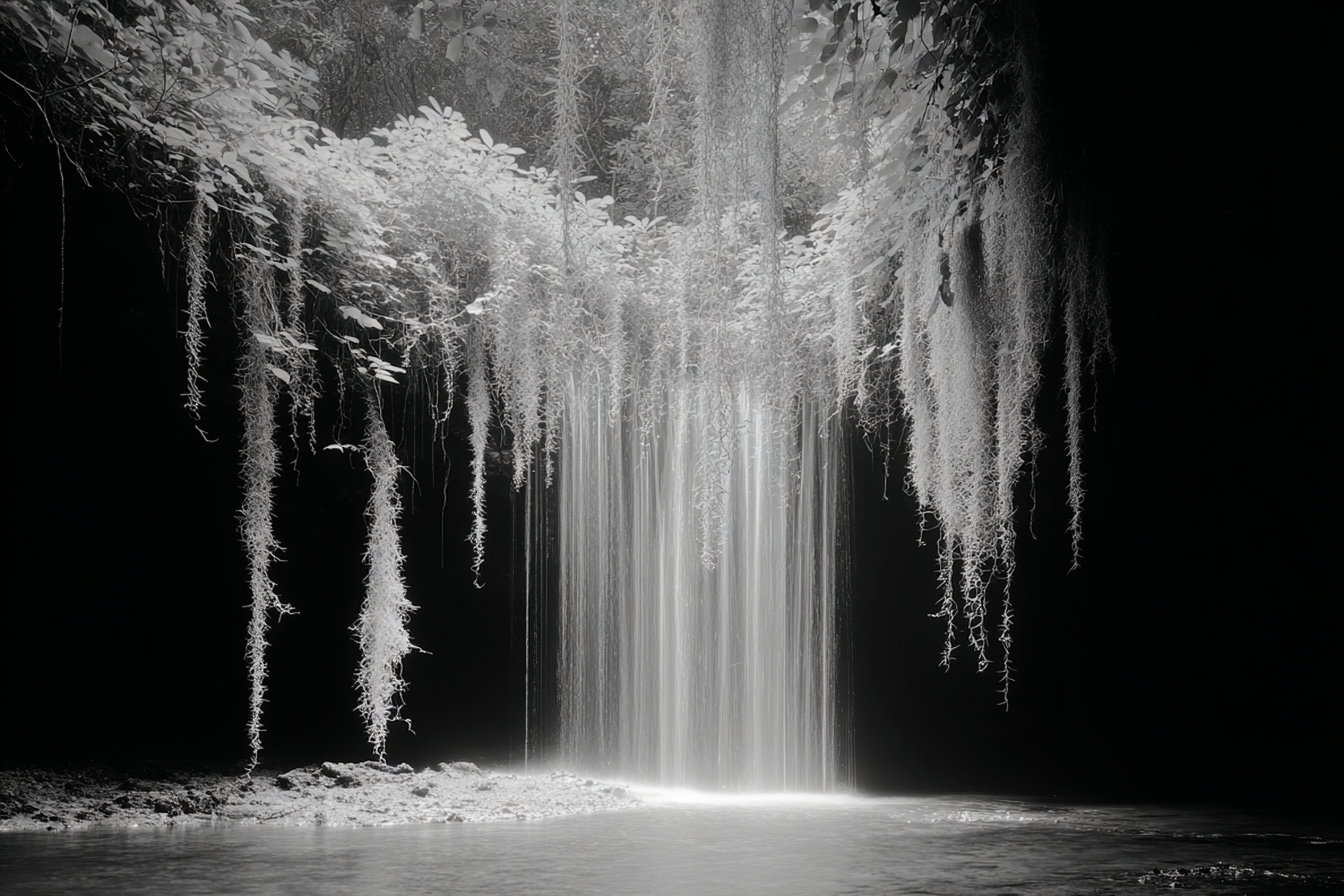 A stunning black-and-white image of a waterfall surrounded by hanging vines and lush foliage, creating a serene and ethereal atmosphere.