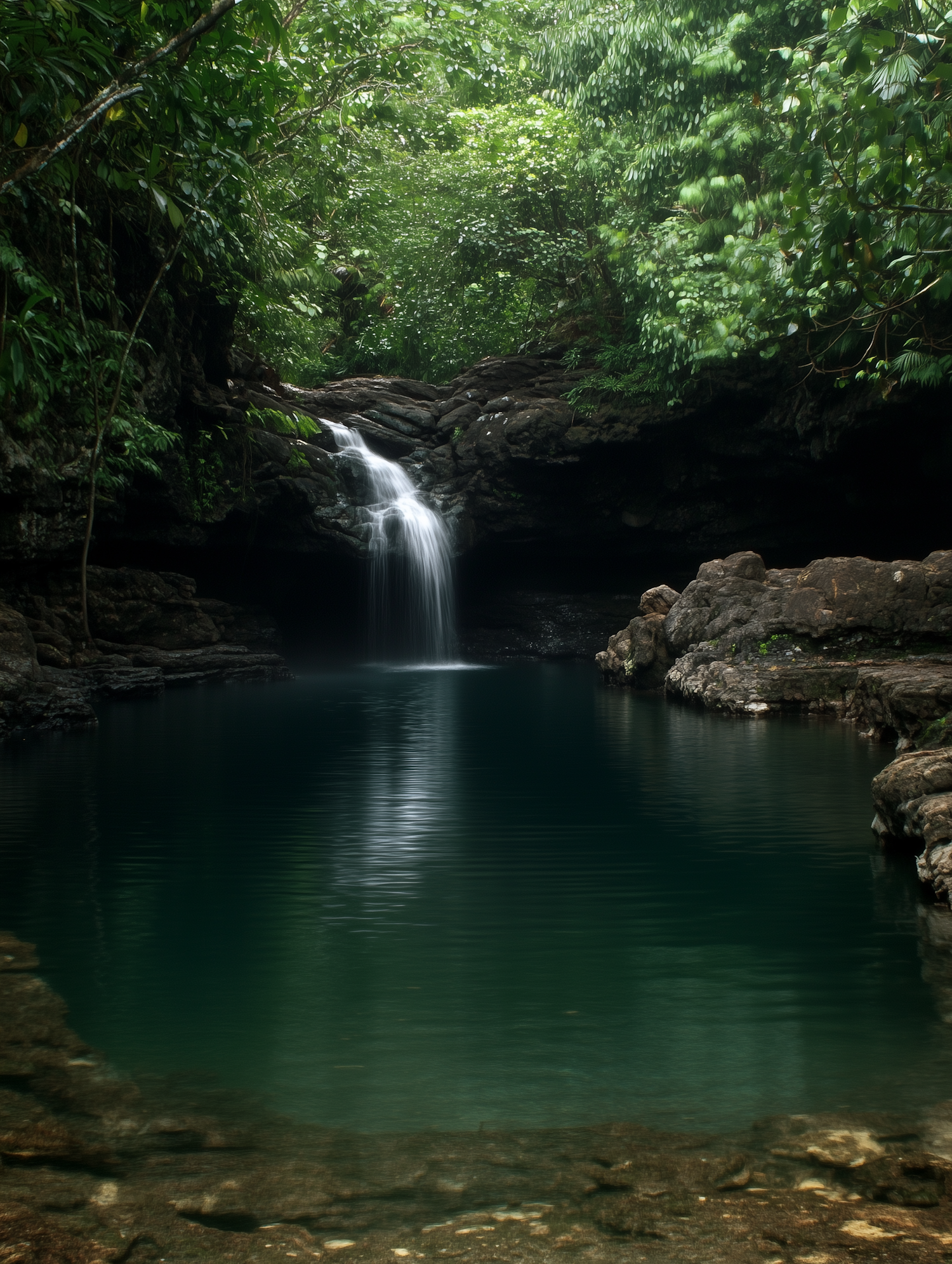 A peaceful waterfall flows into a lush, green pool surrounded by dense forest, creating a tranquil and secluded natural retreat.