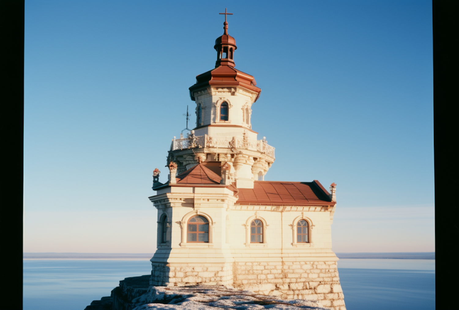 Majestic lighthouse with intricate architecture on a cliff, overlooking a serene sea under a clear blue sky.