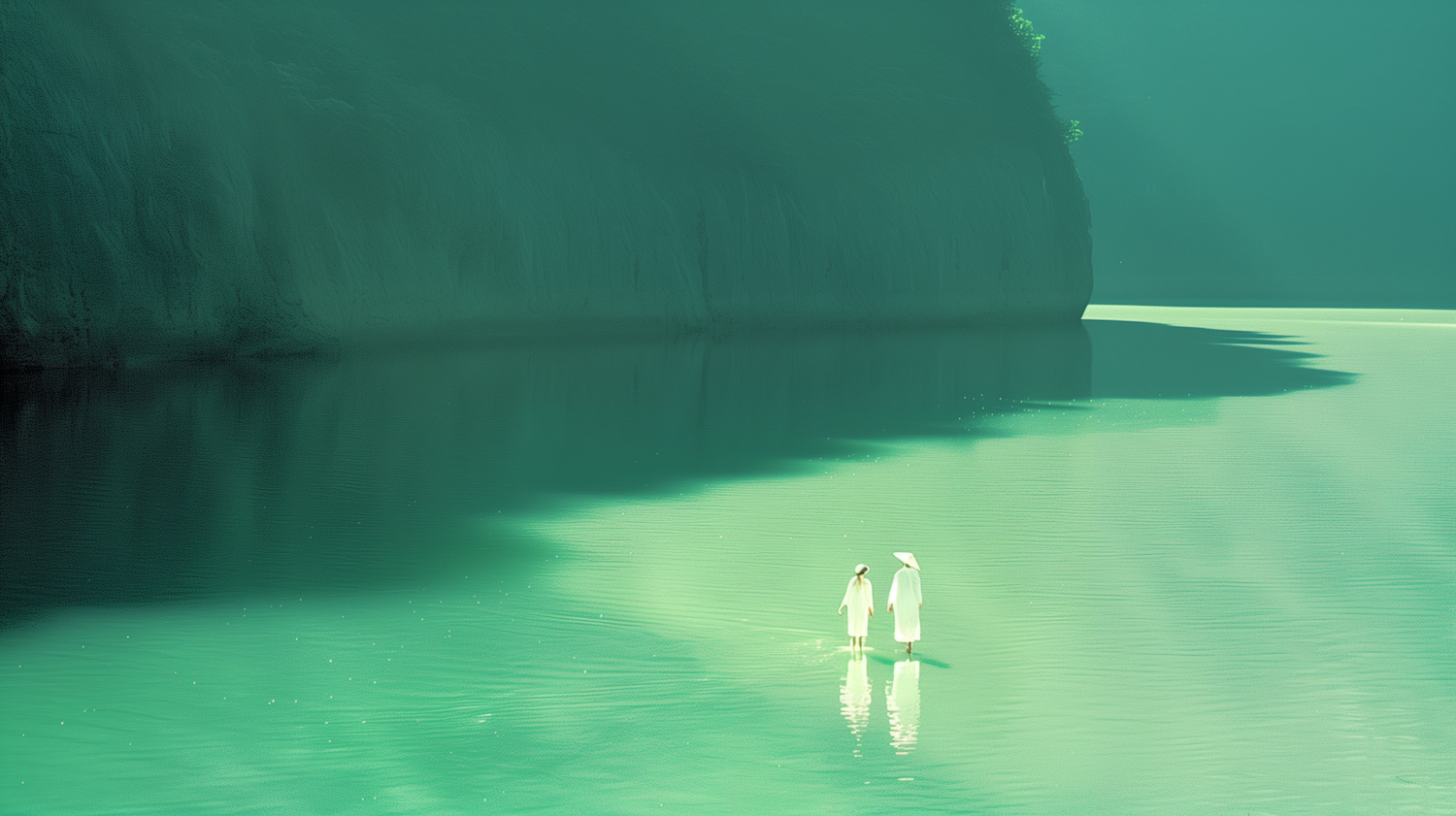 Two figures in white walk on a tranquil, green-tinted water surface, creating a surreal and peaceful scene with reflections and shadows.