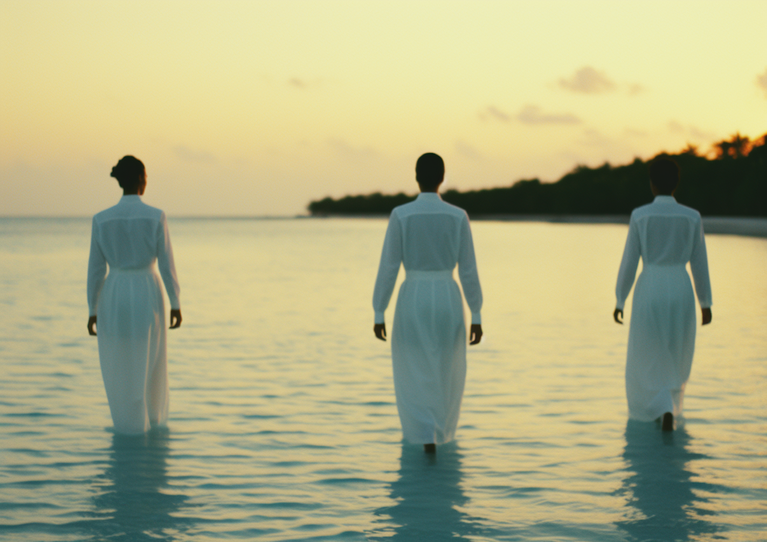 Three women in white dresses walk into the ocean at sunset, creating a serene and peaceful scene.