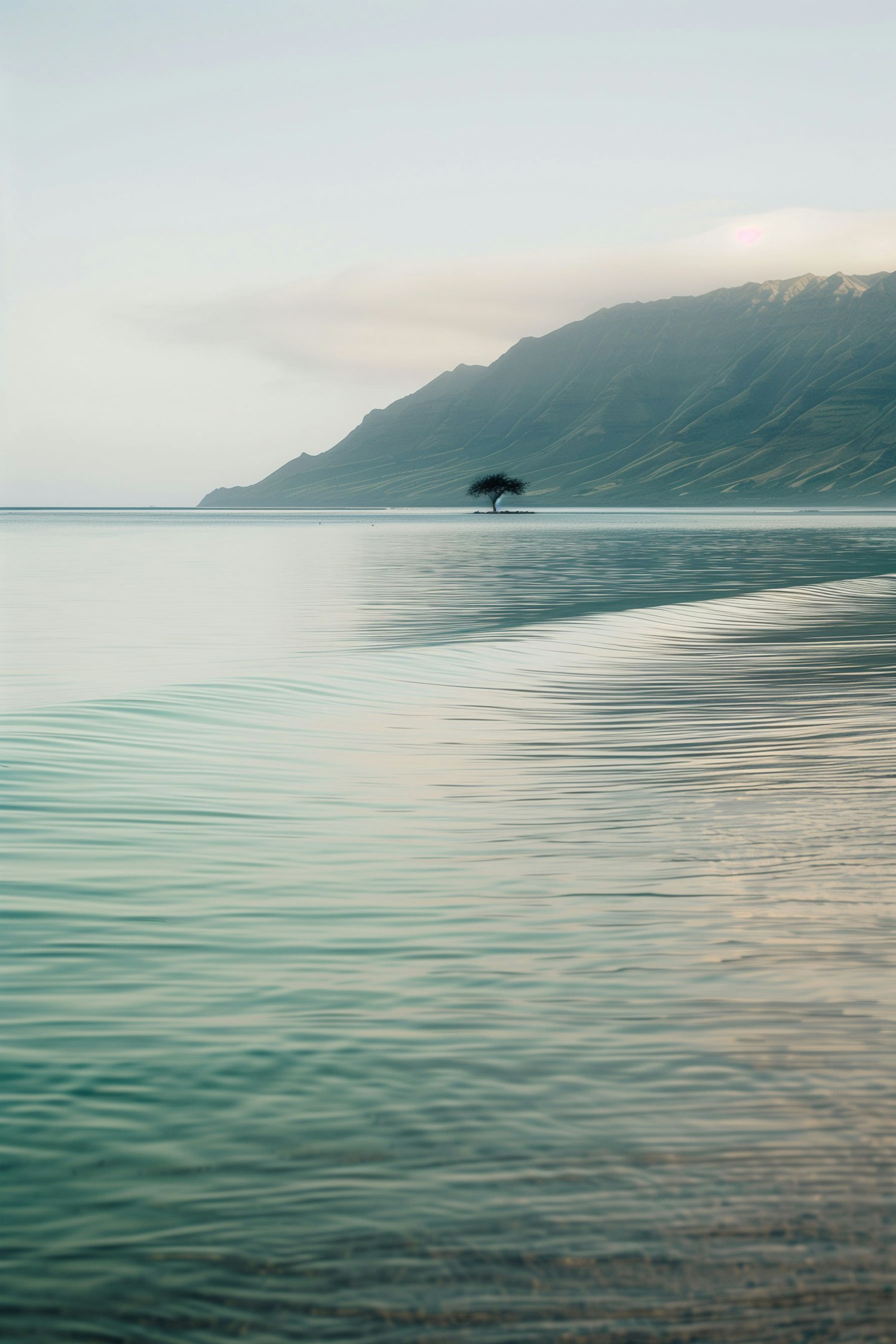 Serene landscape with a solitary tree on an island, calm waters, and misty mountains in the background.