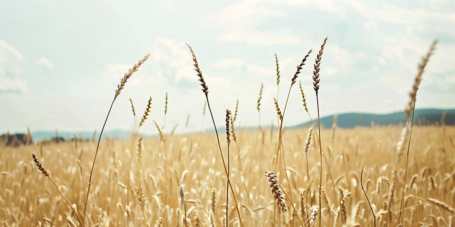 Golden wheat field under a clear blue sky with rolling hills in the background, capturing the essence of a serene rural landscape.