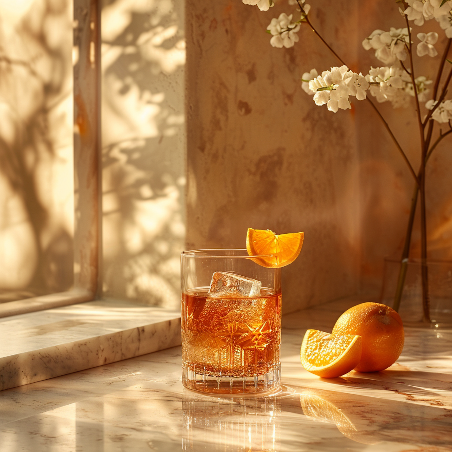 A refreshing iced tea with orange garnish on a sunlit marble counter, surrounded by fresh oranges and delicate white flowers.