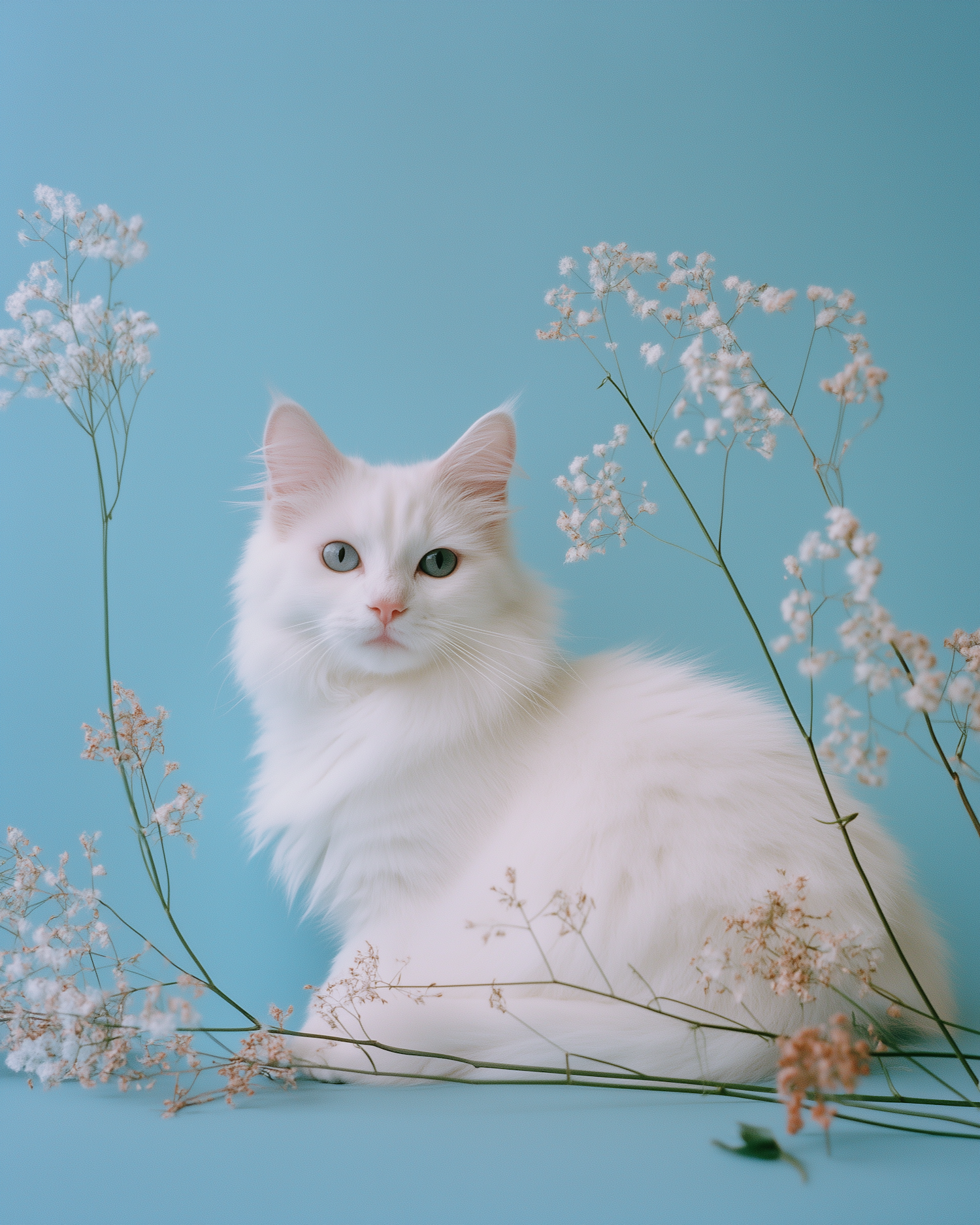 Elegant white cat with green eyes surrounded by baby's breath flowers on a soft blue background.