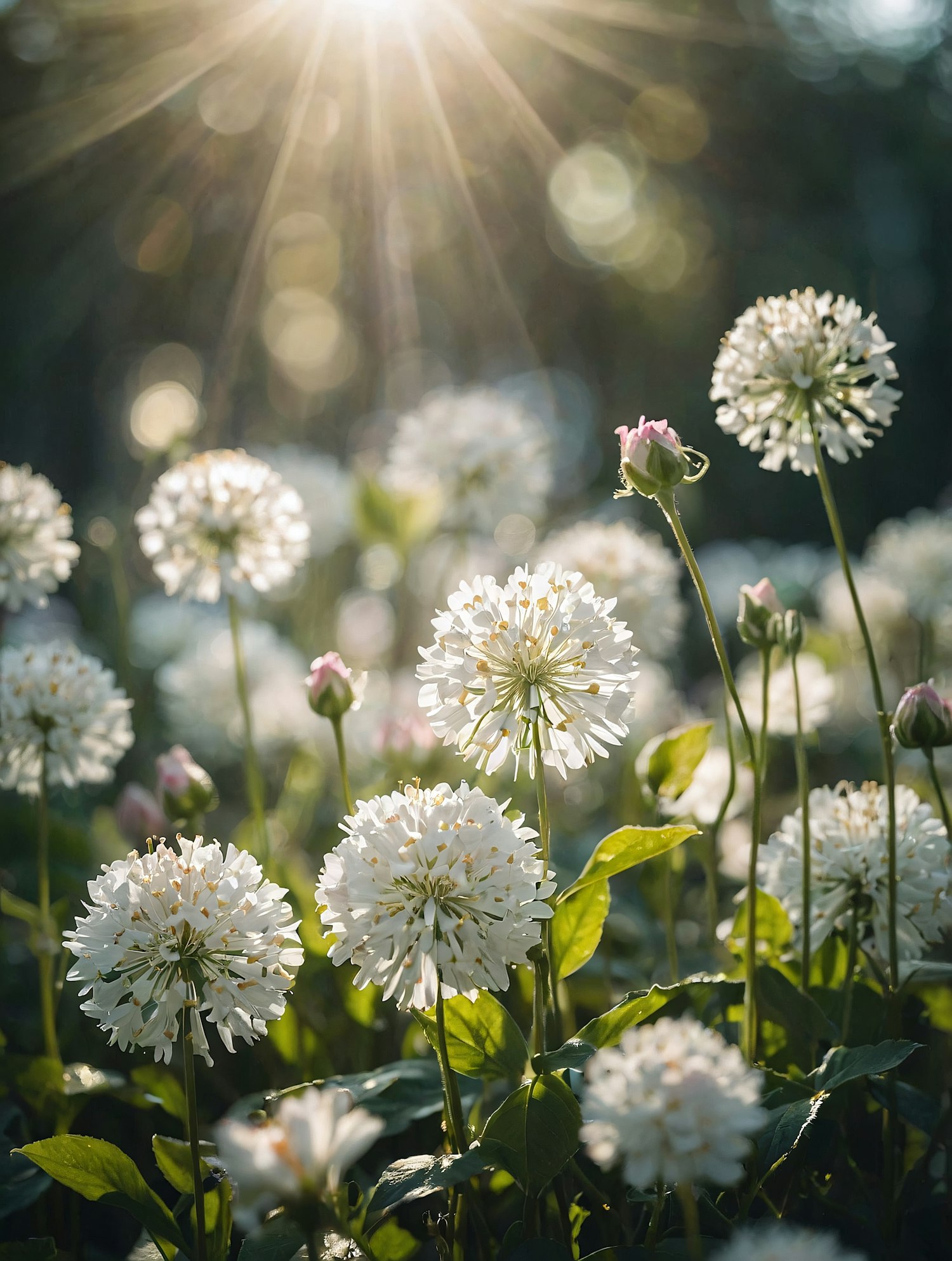 White clover flowers in full bloom under warm sunlight, creating a serene and idyllic natural scene.