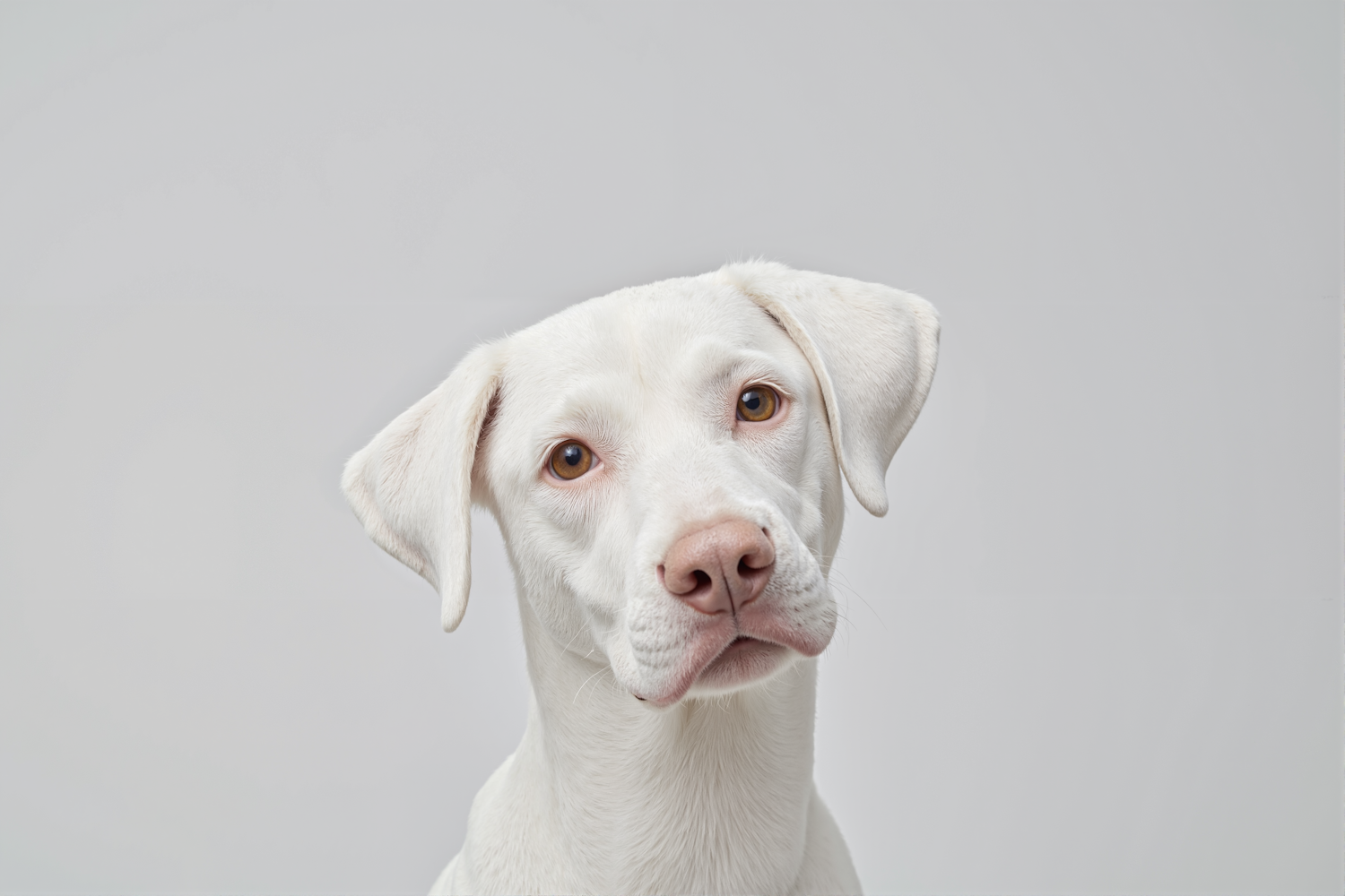 Adorable white dog with floppy ears and curious expression against a light gray background.
