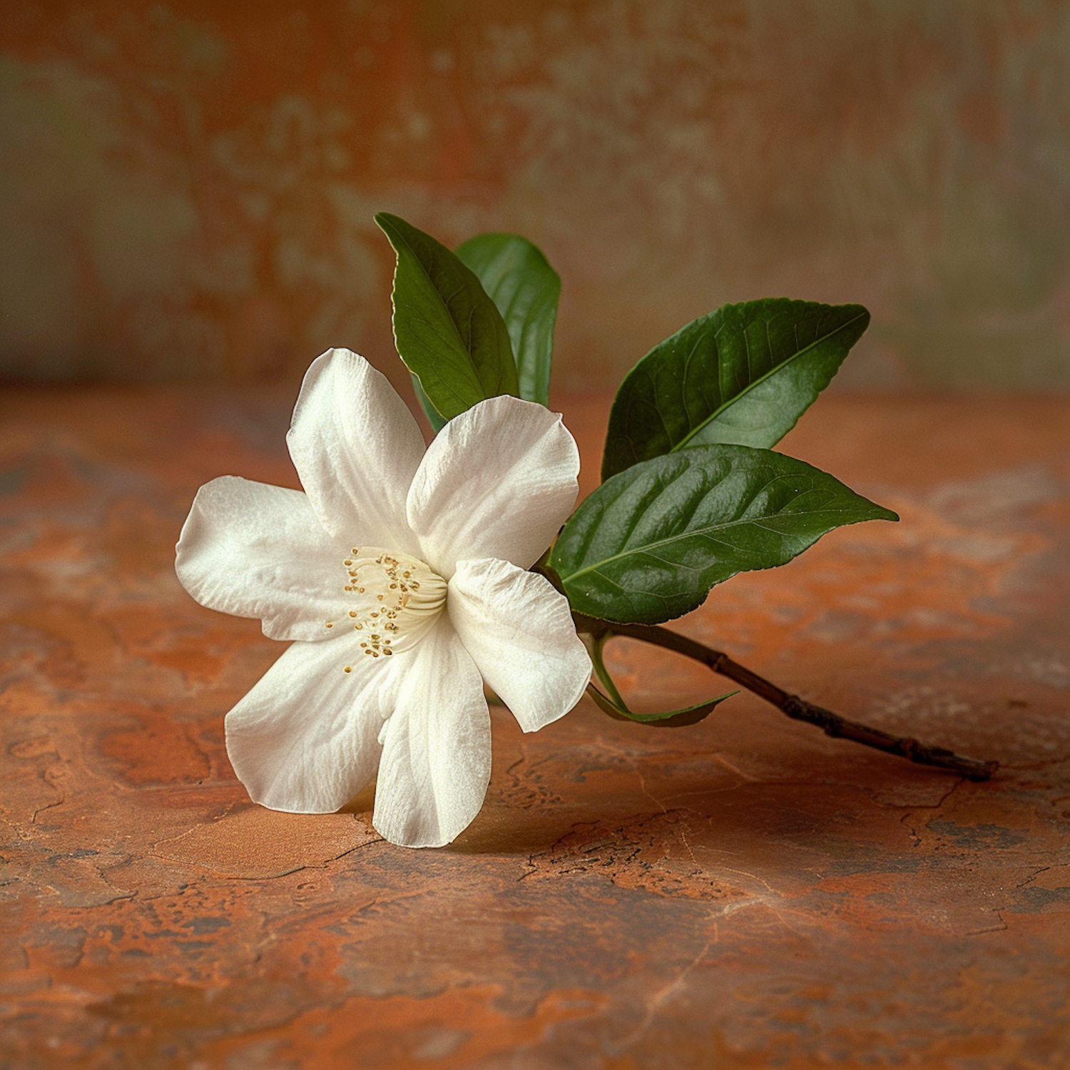 Elegant white flower with green leaves on a textured brown surface, showcasing natural beauty and simplicity.