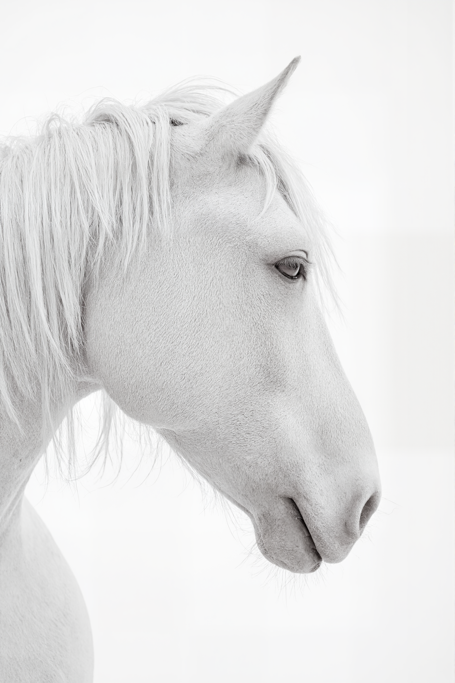 Elegant close-up of a white horse with a flowing mane, showcasing its serene profile against a soft background.