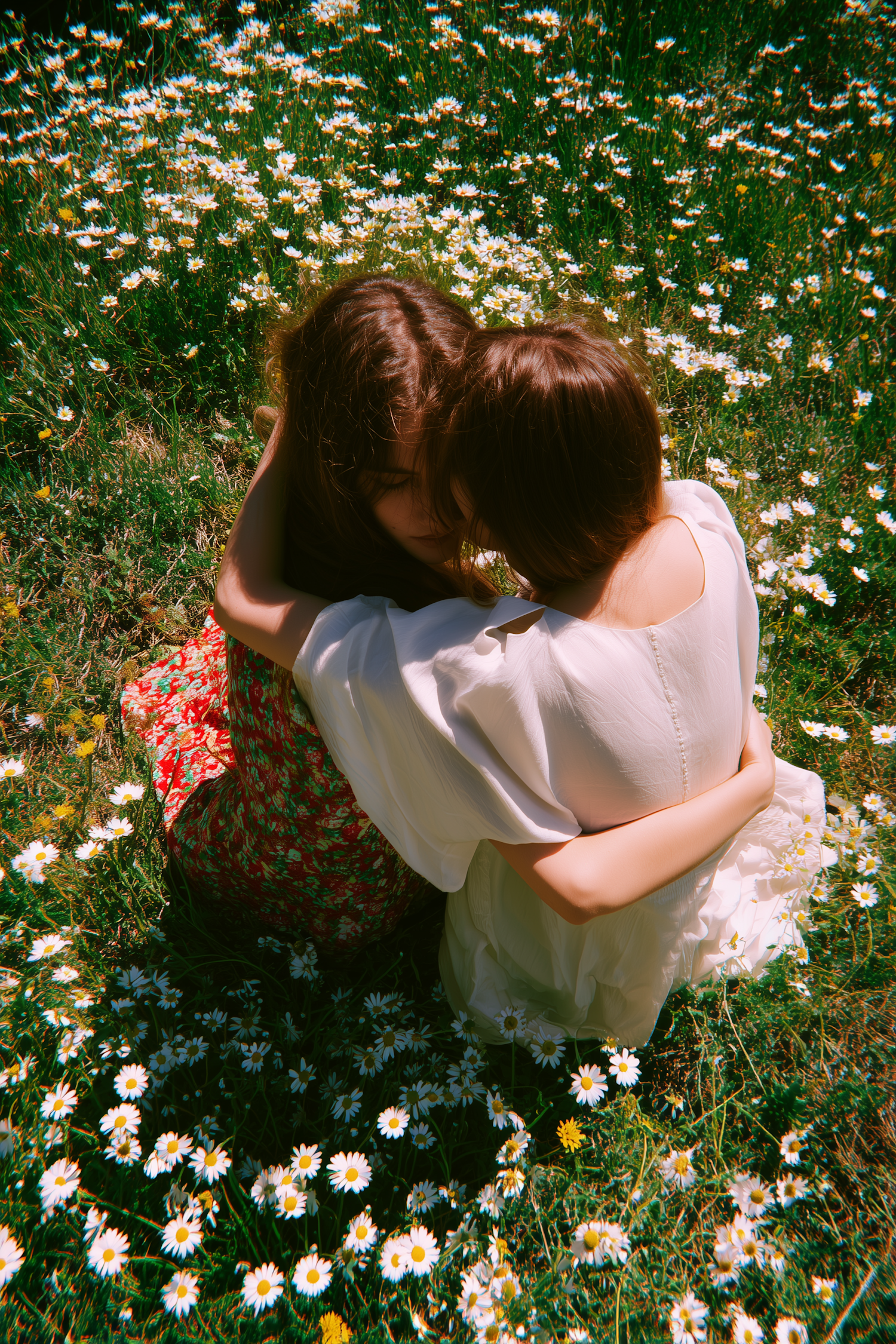 Two people sitting in an embrace surrounded by a field of daisies, their light clothing brightening the tender scene.