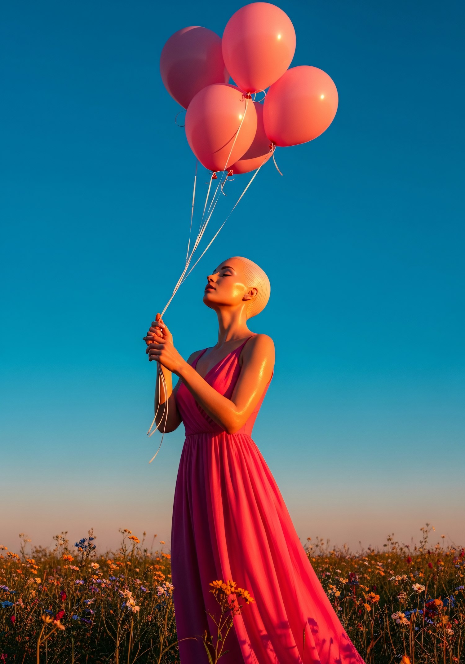 A serene woman in a pink dress holds pink balloons in a vibrant wildflower field under a clear blue sky, bathed in warm sunlight.