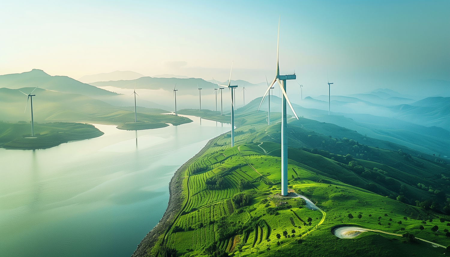 Scenic view of wind turbines on lush green hills with a winding river and serene sky, highlighting renewable energy in nature.