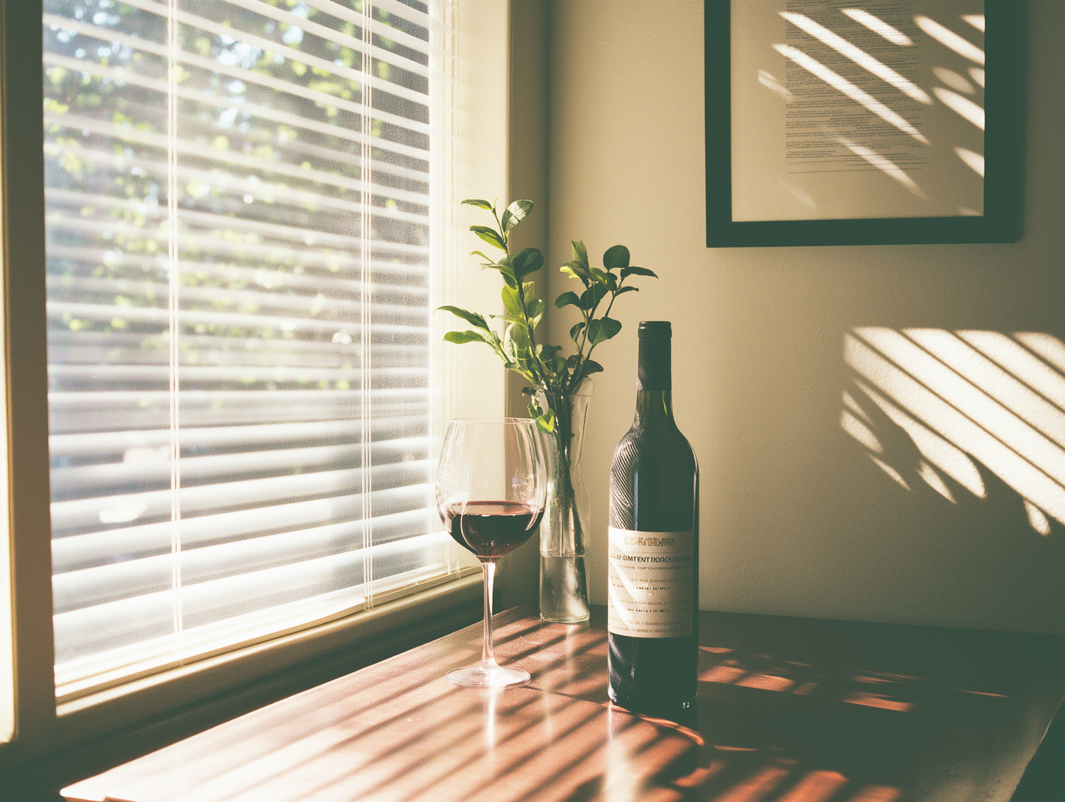 Sunlit table with a bottle of red wine, a glass, and a vase with leaves. Warm light and shadows create a cozy atmosphere.