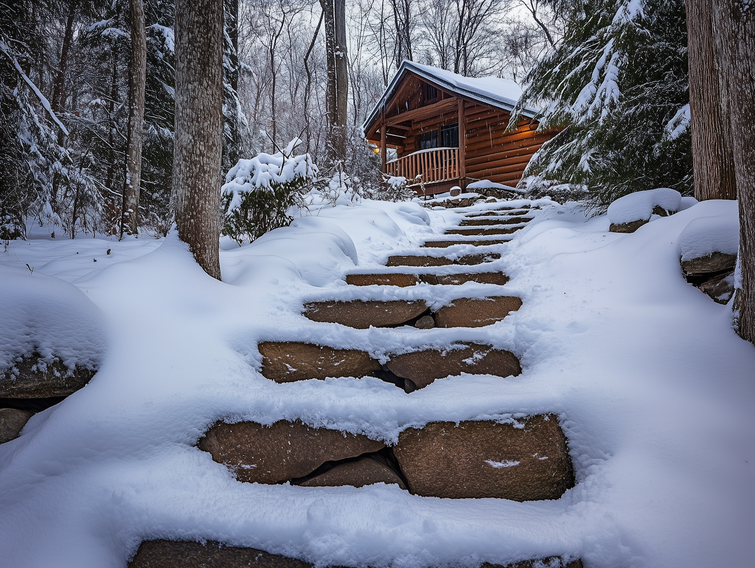 Snow-covered stone steps lead to a cozy log cabin in a serene winter forest, with warm light glowing from the windows.