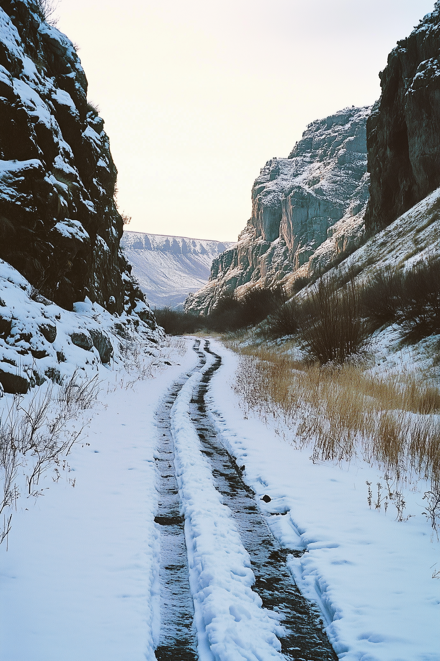 Snowy canyon path with tire tracks, flanked by towering rock formations and sparse vegetation under a soft gradient sky.