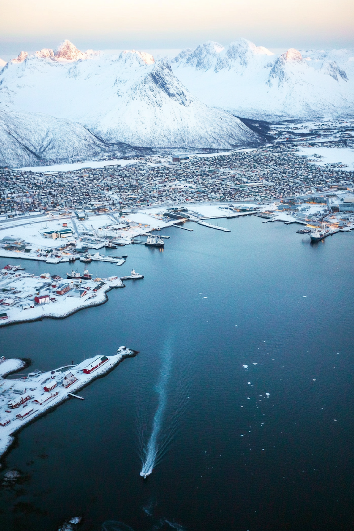 Aerial view of a snowy coastal town with majestic mountains and a boat on the water, under a serene sky.