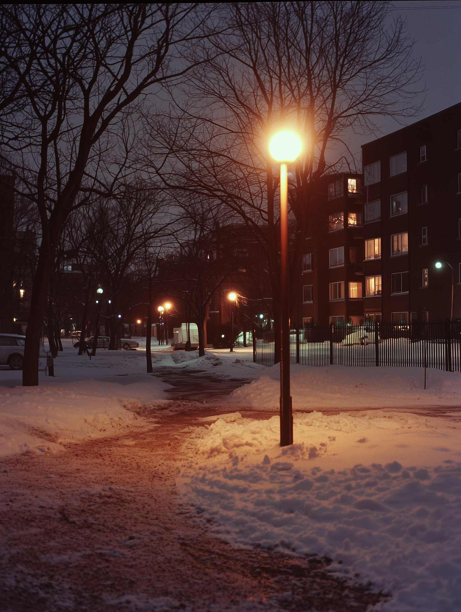 Snowy pathway lit by warm streetlights on a quiet winter evening, surrounded by bare trees and glowing apartment windows.