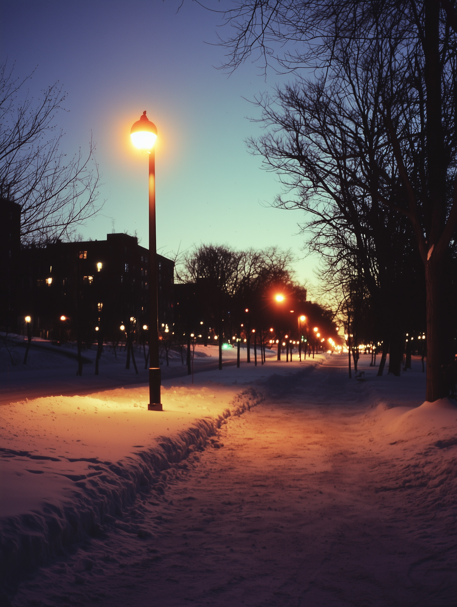 A snowy pathway at dusk, lined with glowing streetlights and bare trees, creating a peaceful winter evening ambiance.