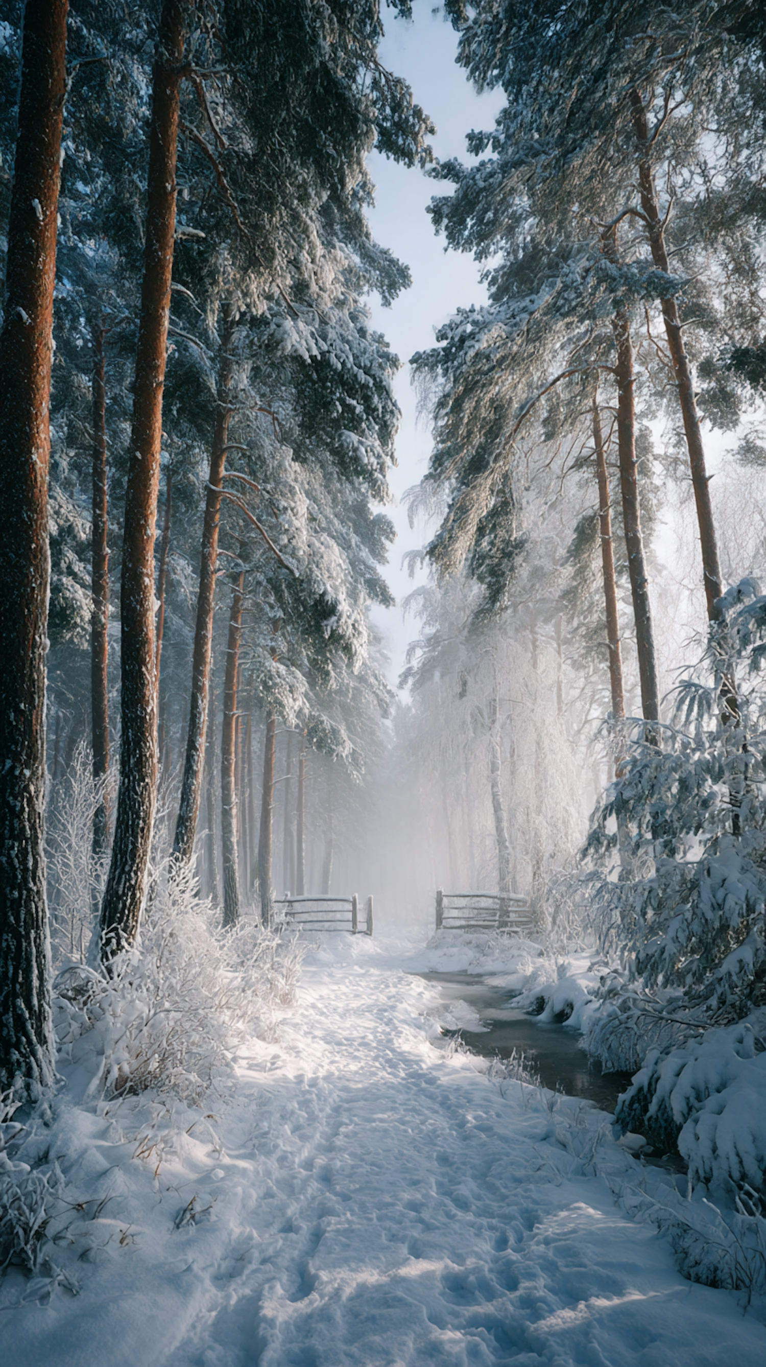 A tranquil snowy forest path with tall trees, a wooden fence, and a stream, bathed in soft sunlight filtering through the branches.
