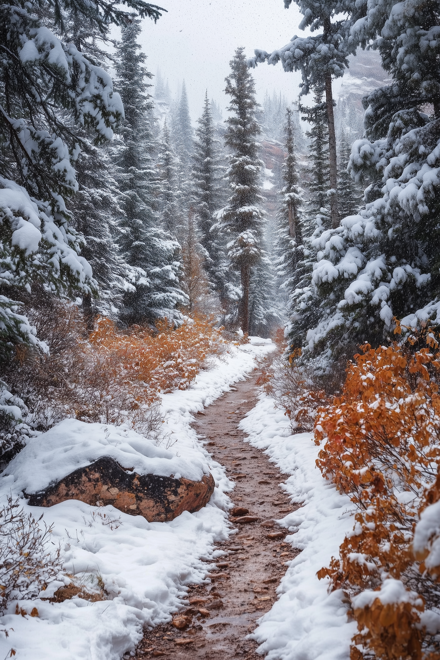 Snow-covered forest path with evergreen trees and golden-brown bushes, creating a serene winter landscape.