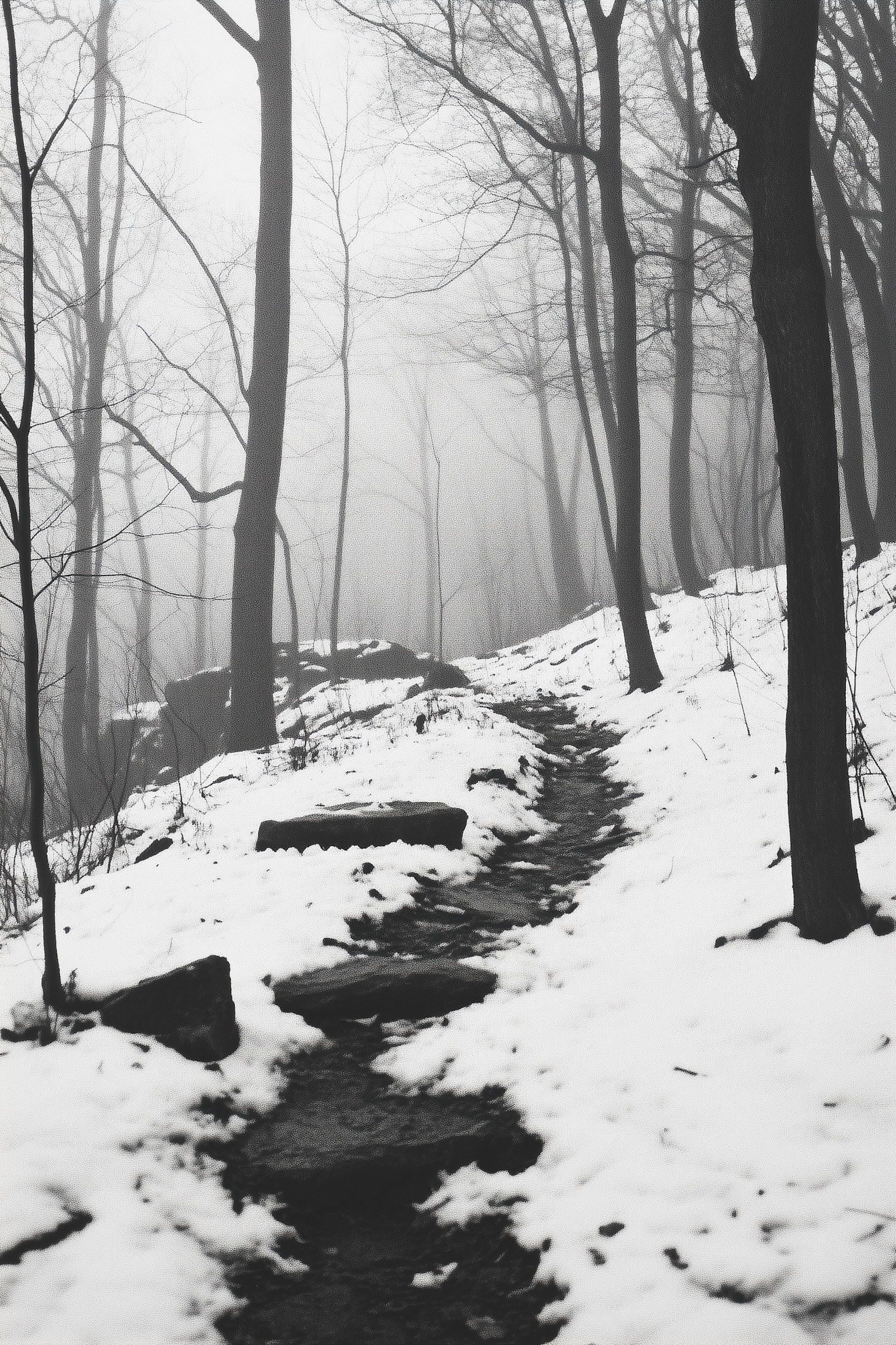 A misty forest path winds through snow-covered trees, creating a serene and mysterious winter landscape.