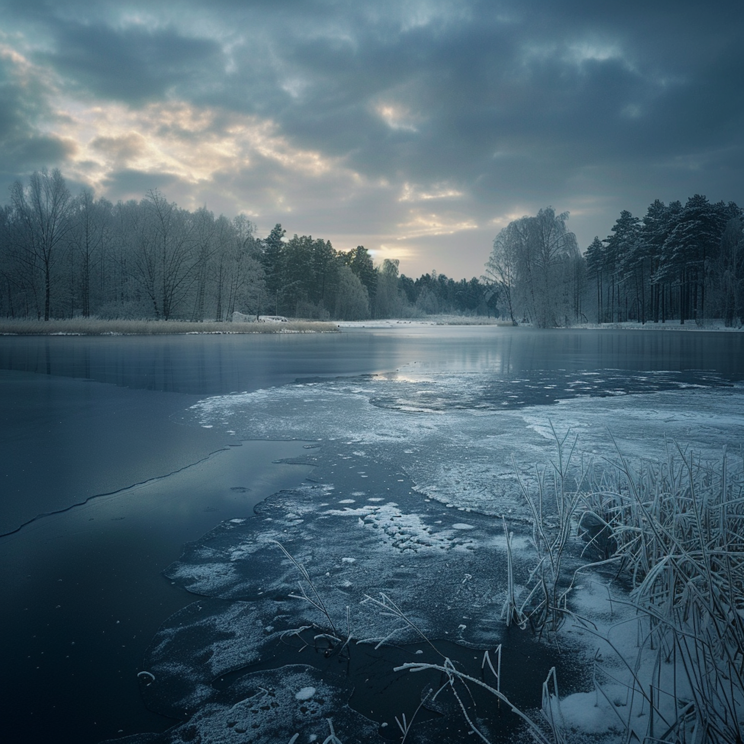 A tranquil winter scene of a frozen lake with frosty reeds and a snow-dusted forest under a cloudy sky.