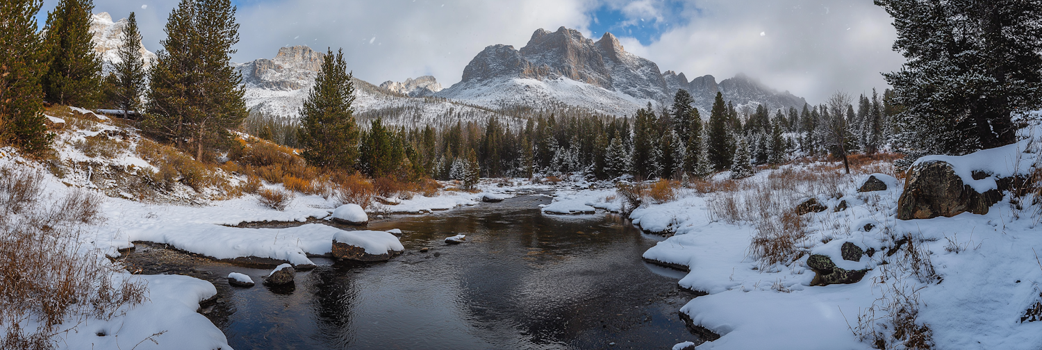 Breathtaking winter landscape with a snowy river, evergreen trees, and majestic mountains under a partly cloudy sky.
