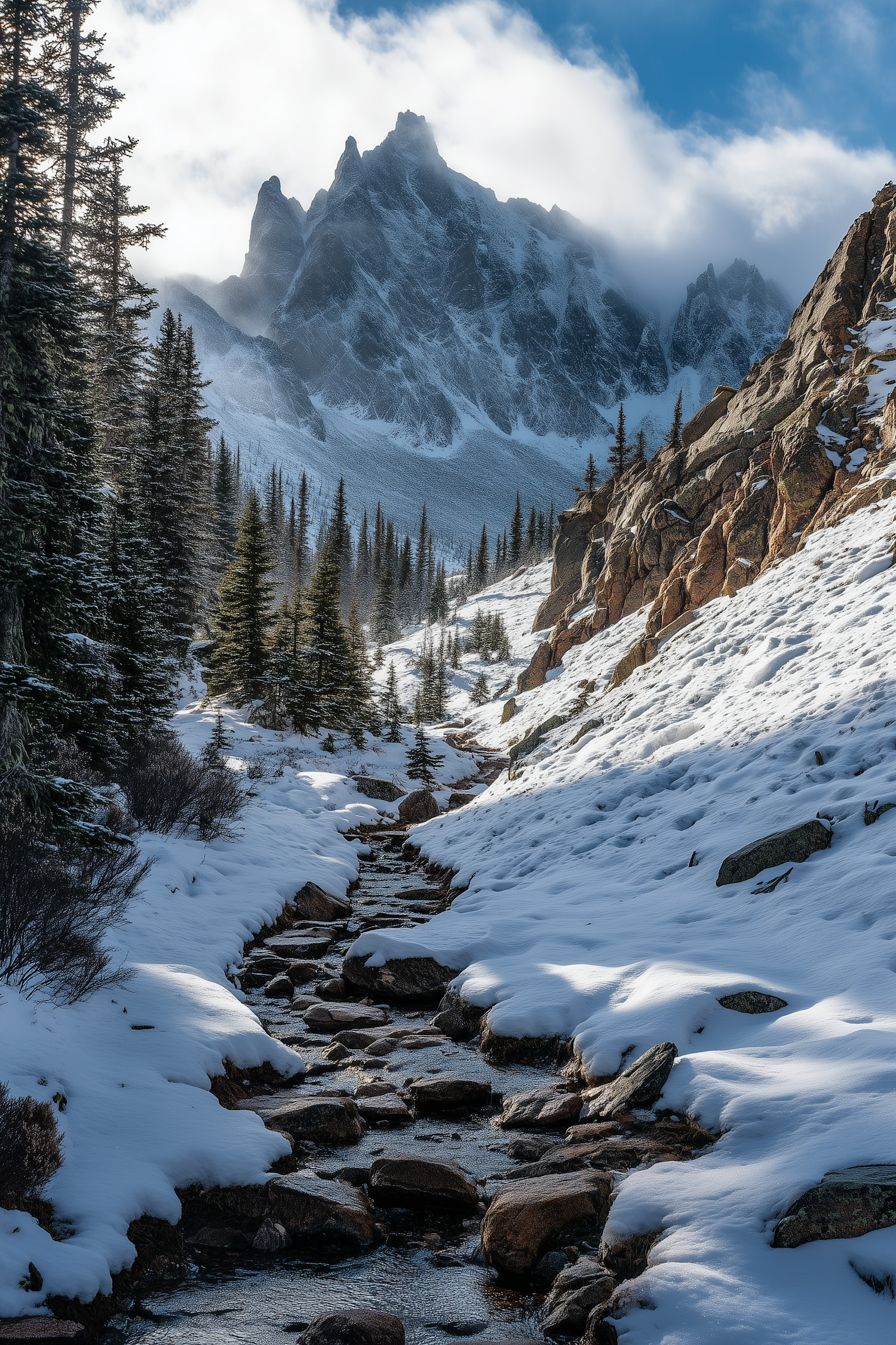 Snowy mountain landscape with a winding stream, evergreen trees, and dramatic peaks under a blue sky.
