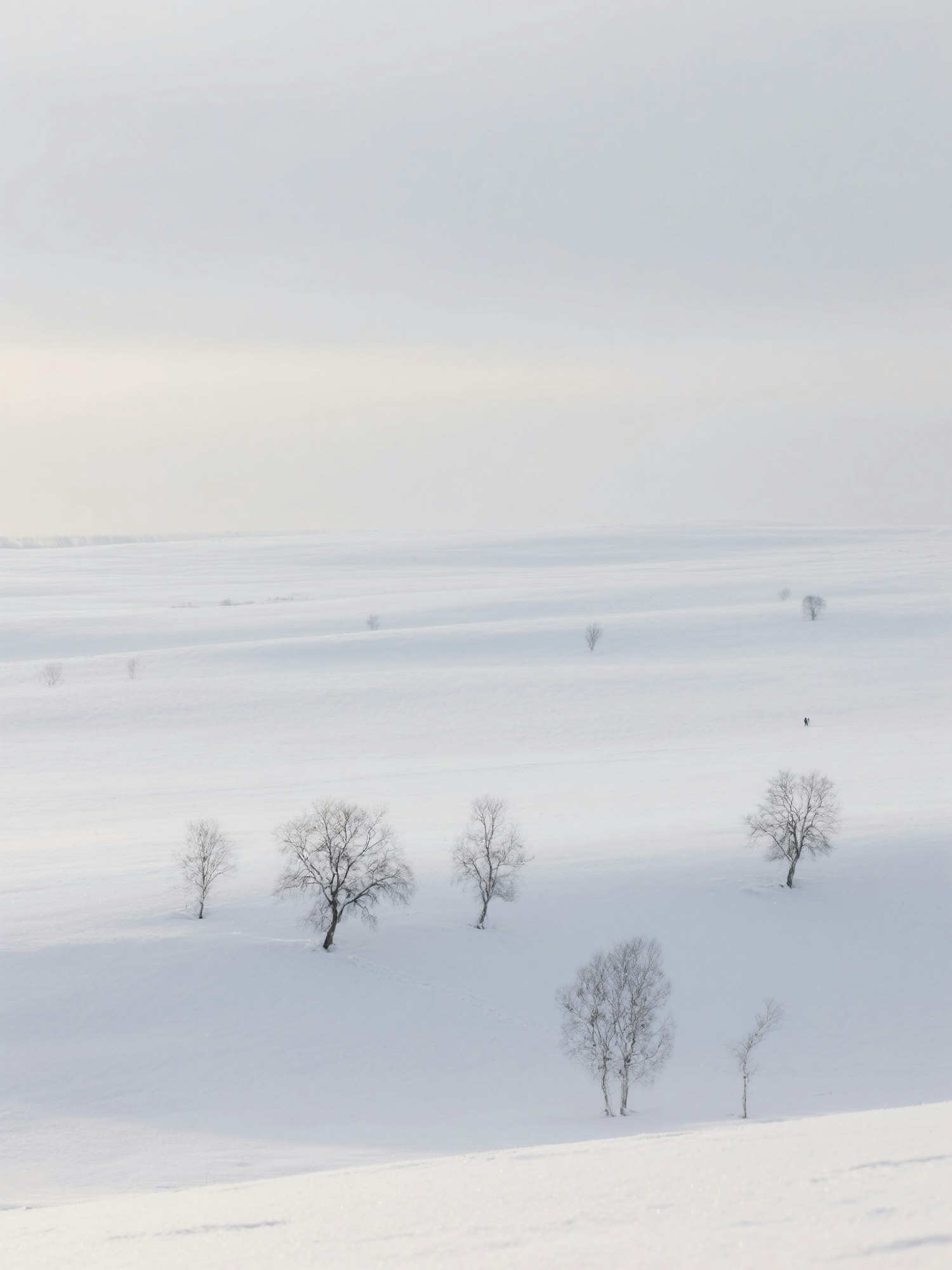 a minimalist and cinematic landscape, natural lighting, realistic details, soft contrast, slightly desaturated tones, large depth of field, peaceful atmosphere, no people, high resolution, editorial style, empty snowy plain with a few scattered trees, soft overcast light, pure and quiet mood