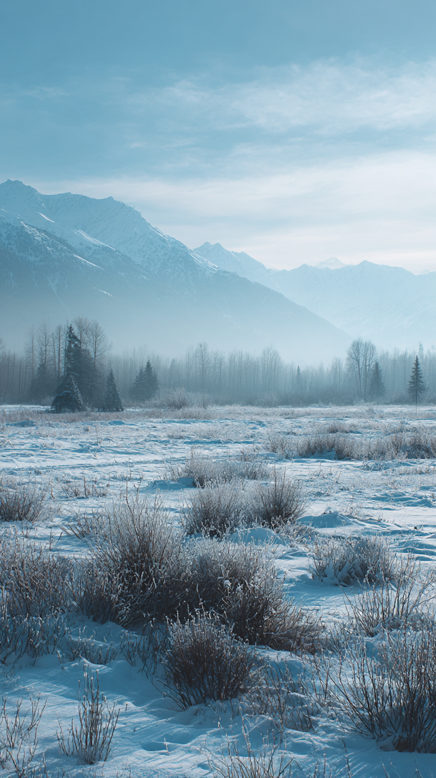 A tranquil winter scene with snow-covered fields, frosty bushes, and majestic mountains under a soft blue sky.