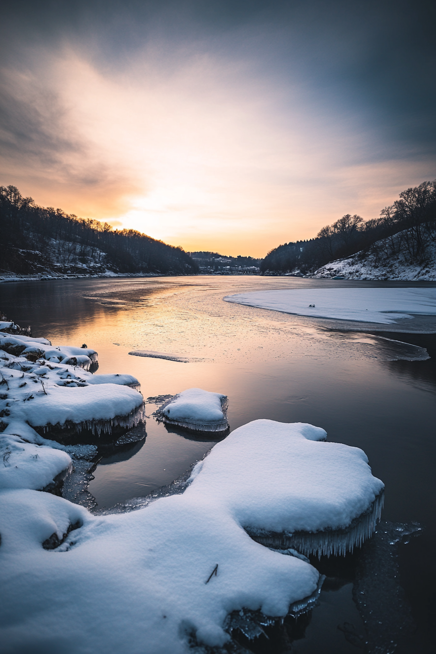 Serene winter river scene with snow-covered rocks, icy water, and a warm sunset glow. Tranquil and picturesque landscape.