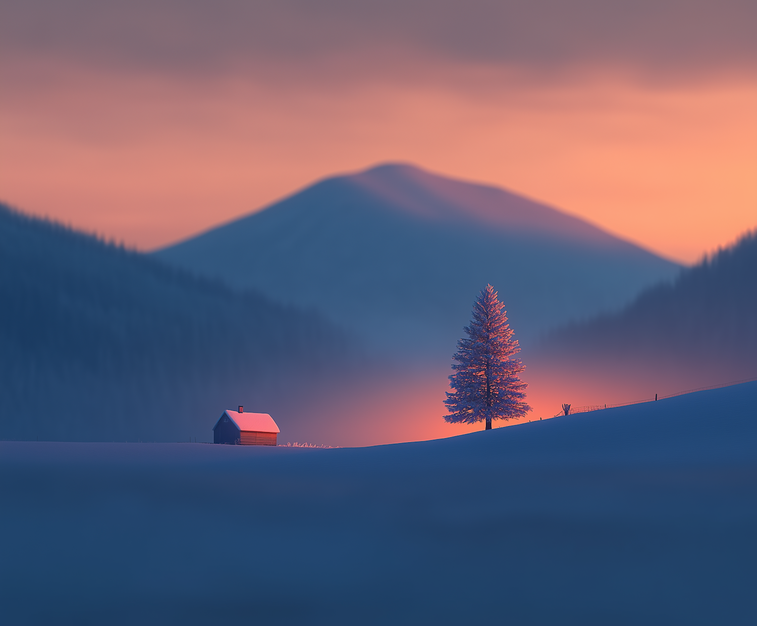 A tranquil winter scene with a snow-covered cabin and tree, set against a backdrop of misty mountains and a warm, colorful sky.