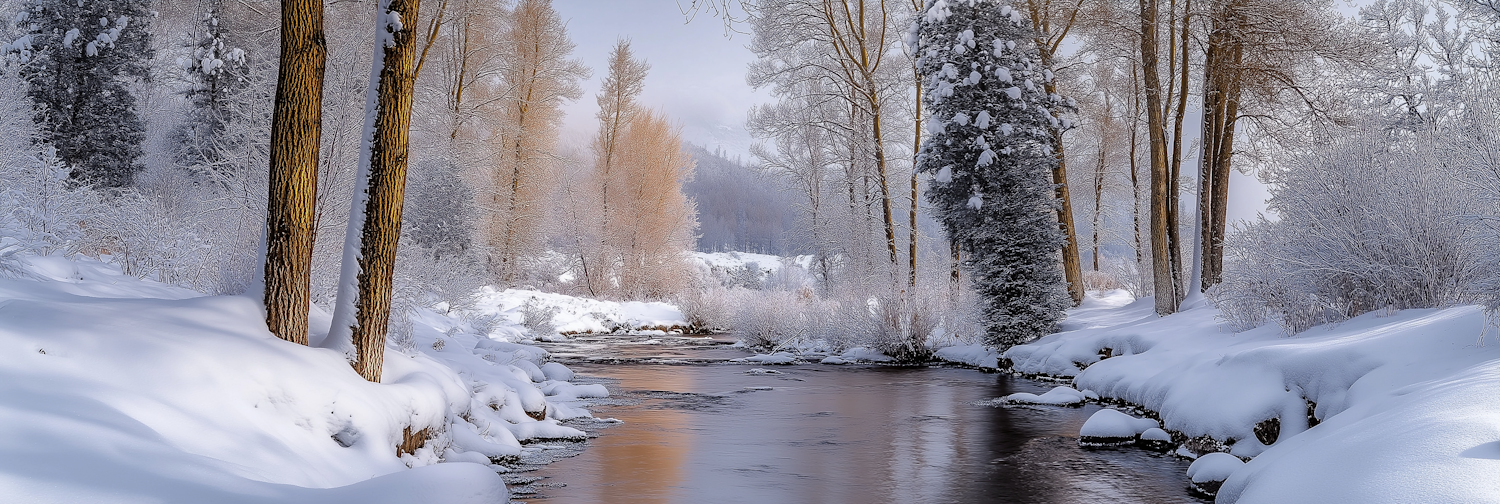 A peaceful winter river winds through a snowy forest with golden-brown trees and frosted bushes, reflecting soft hues of the sky.