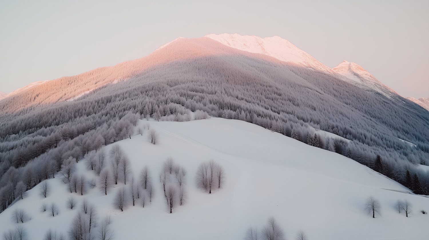 Serene winter landscape with snow-covered mountains and frosted trees under a pastel sky, creating a tranquil and peaceful atmosphere.