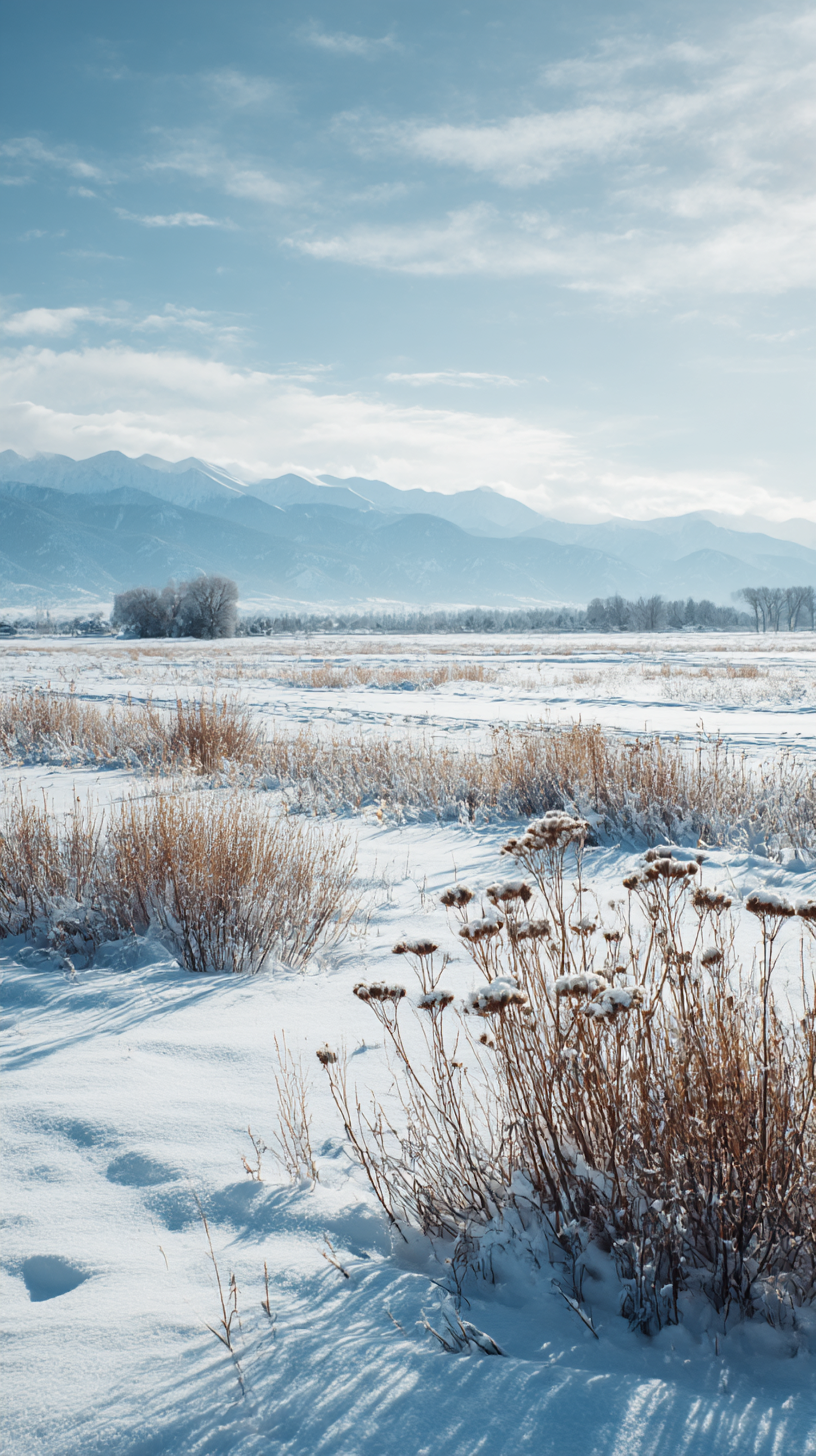 A tranquil snowy field with golden plants and a mountain range in the background under a clear blue sky.