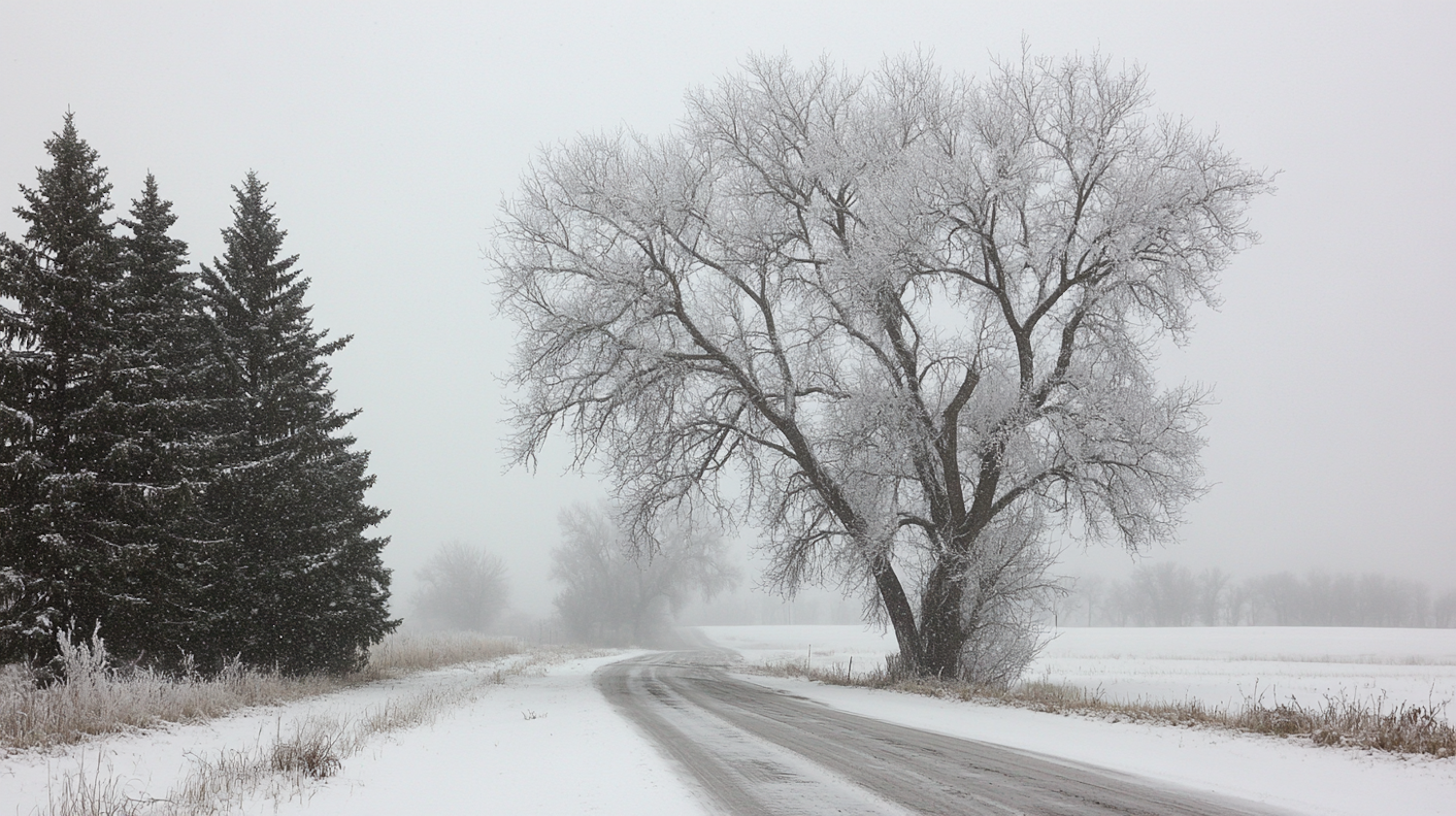 Snowy road curves through a tranquil winter landscape with frosted trees and an overcast sky.