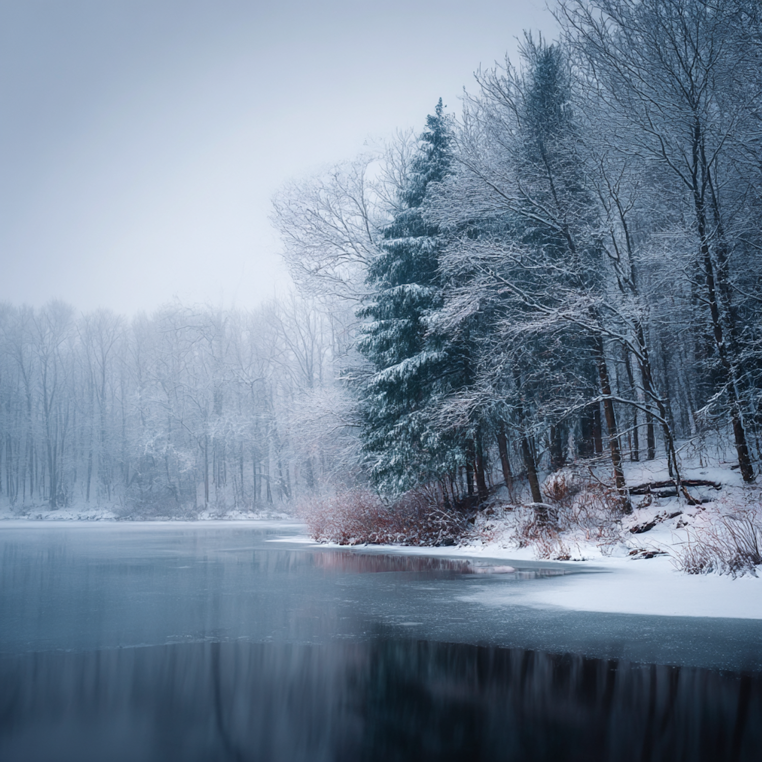 A tranquil winter scene with a frozen lake, snow-covered trees, and a serene, misty atmosphere.