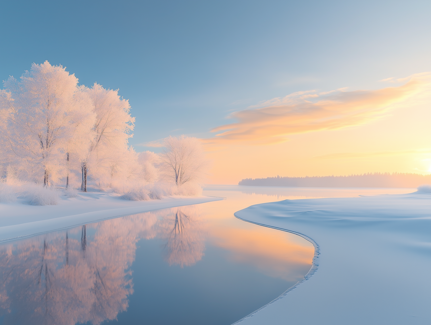 A tranquil winter scene with frosted trees, a reflective river, and a golden sunrise casting warm light over the snowy landscape.