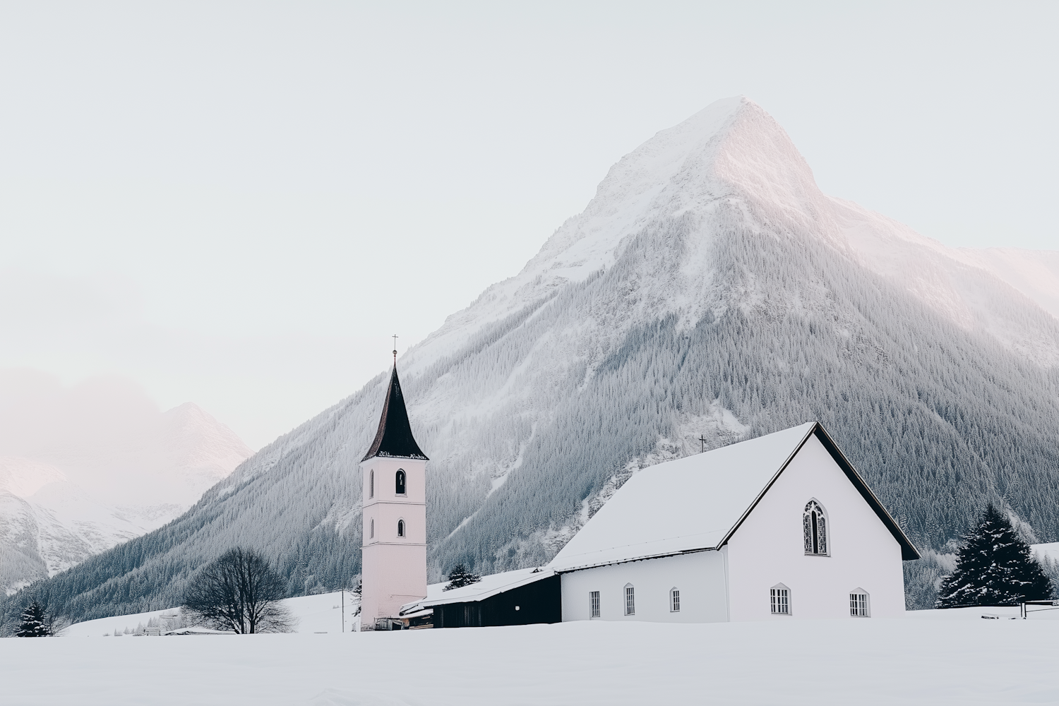 Snow-covered church with a tall steeple set against a majestic mountain backdrop, surrounded by serene winter scenery.