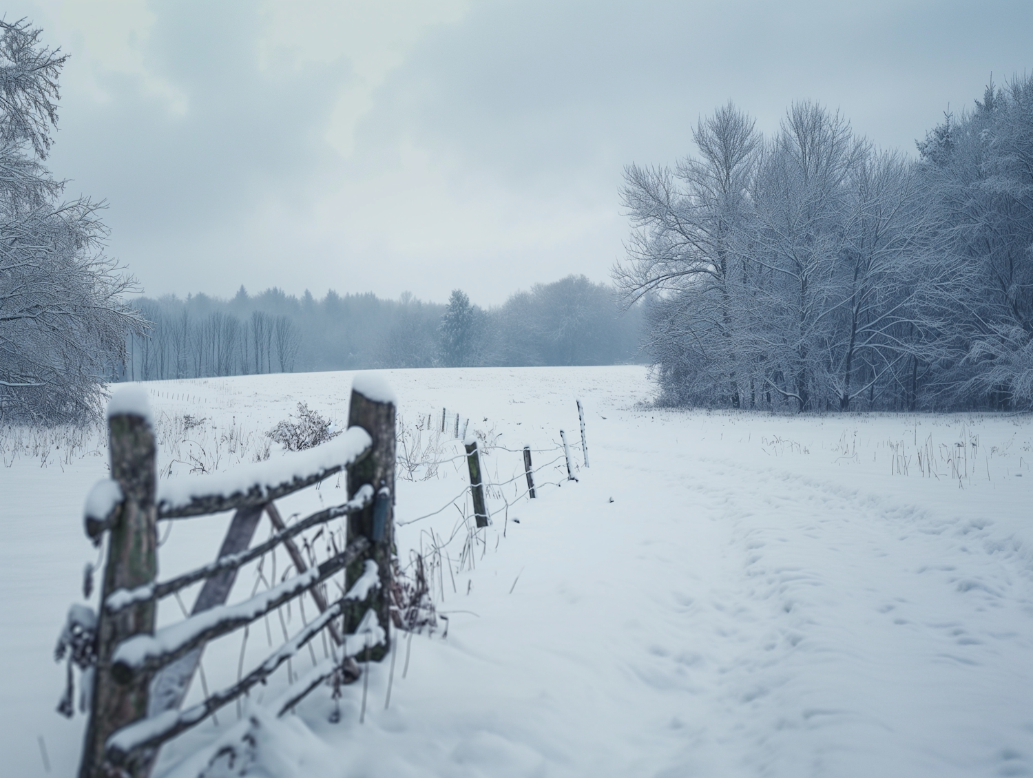Serene winter landscape with snow-covered fields, rustic fence, and bare trees under an overcast sky, creating a tranquil atmosphere.
