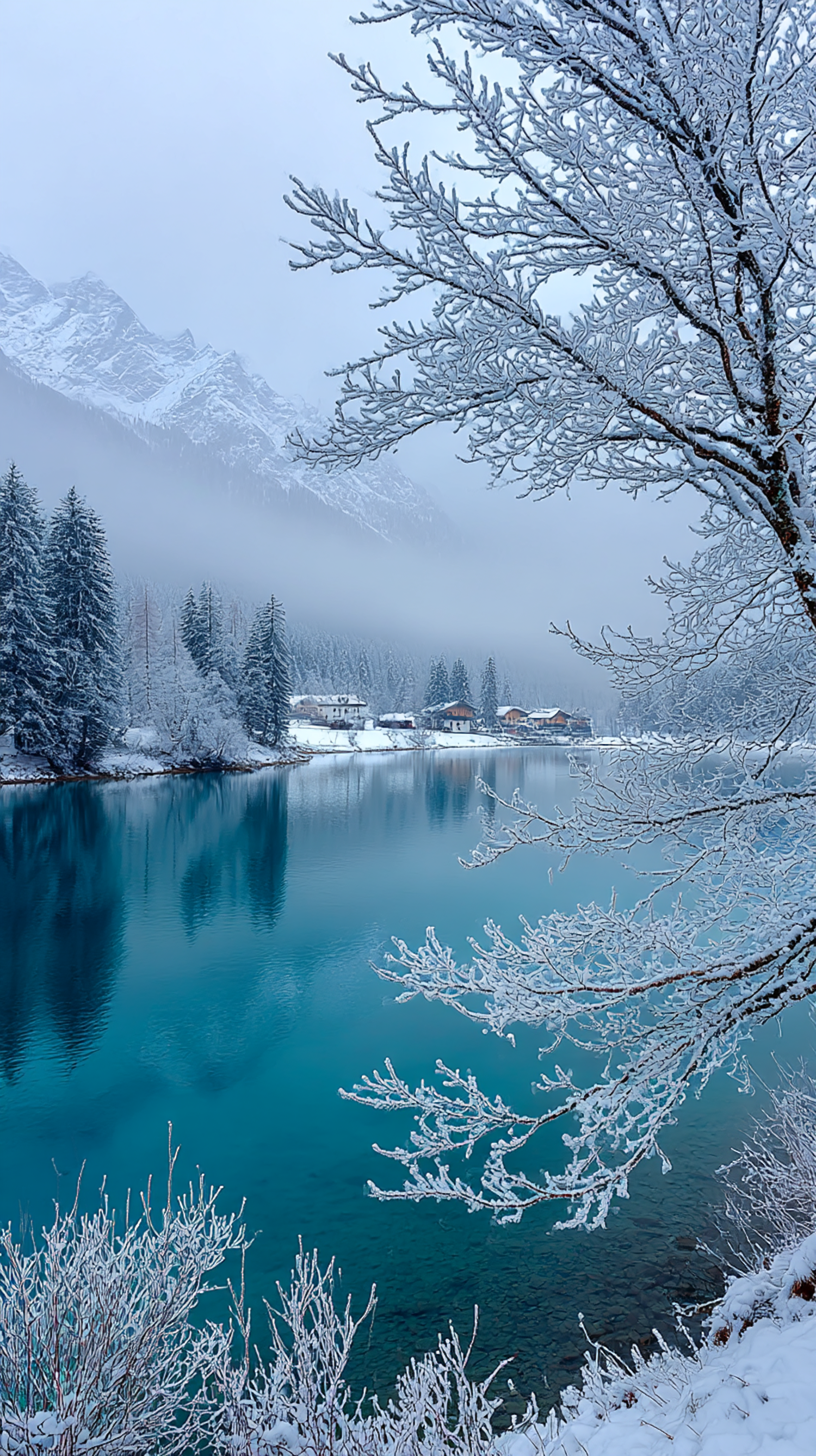 A tranquil winter scene with a snowy lake, frosted trees, and distant houses under a misty mountain backdrop.