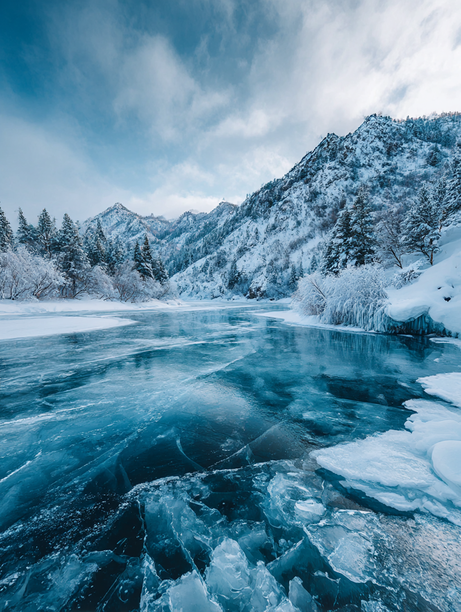 A frozen river with intricate ice patterns, surrounded by snow-covered trees and mountains under a partly cloudy blue sky.