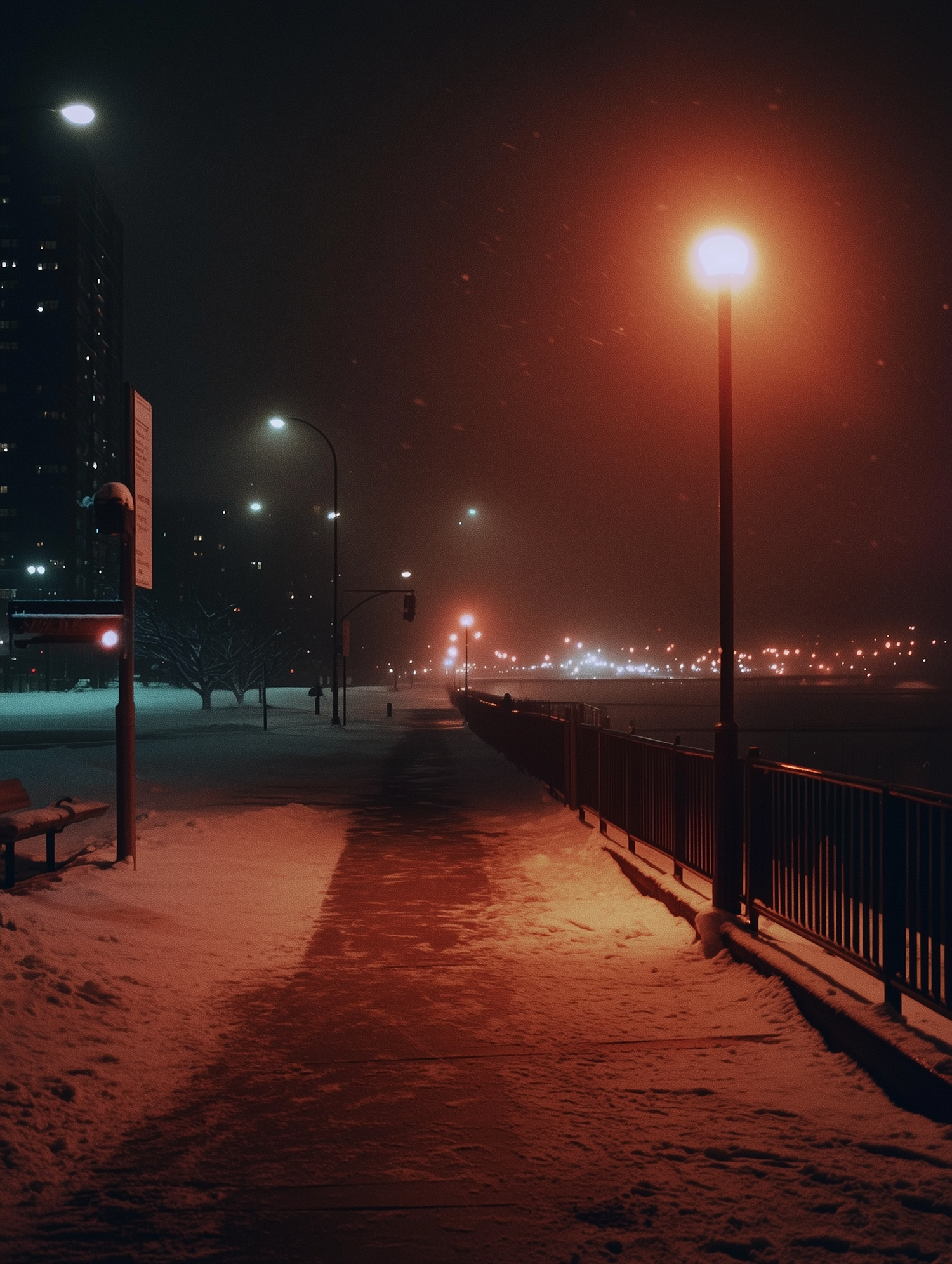 A quiet, snow-covered sidewalk at night, warmly lit by orange streetlights, with a serene winter atmosphere and faintly visible buildings.