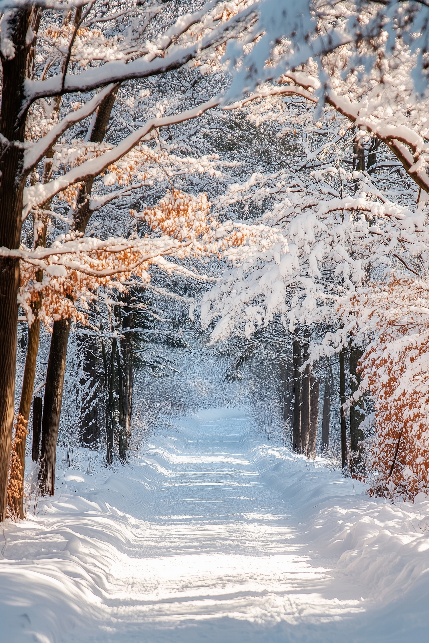 Snow-covered path through a winter forest, with sunlit trees and a serene, tranquil atmosphere.