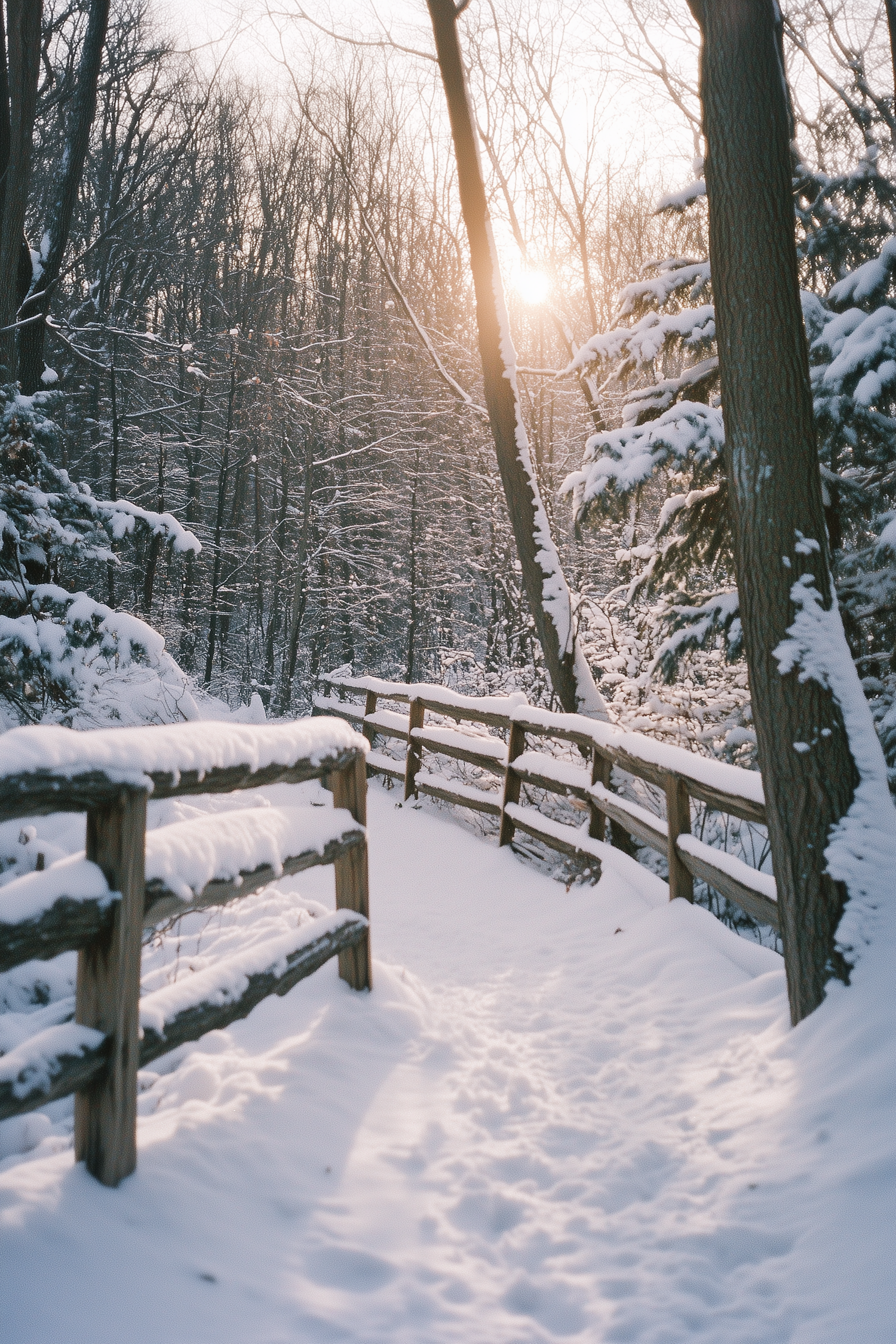 Snow-covered path in a tranquil forest with wooden fences and sunlit trees, creating a serene winter landscape.