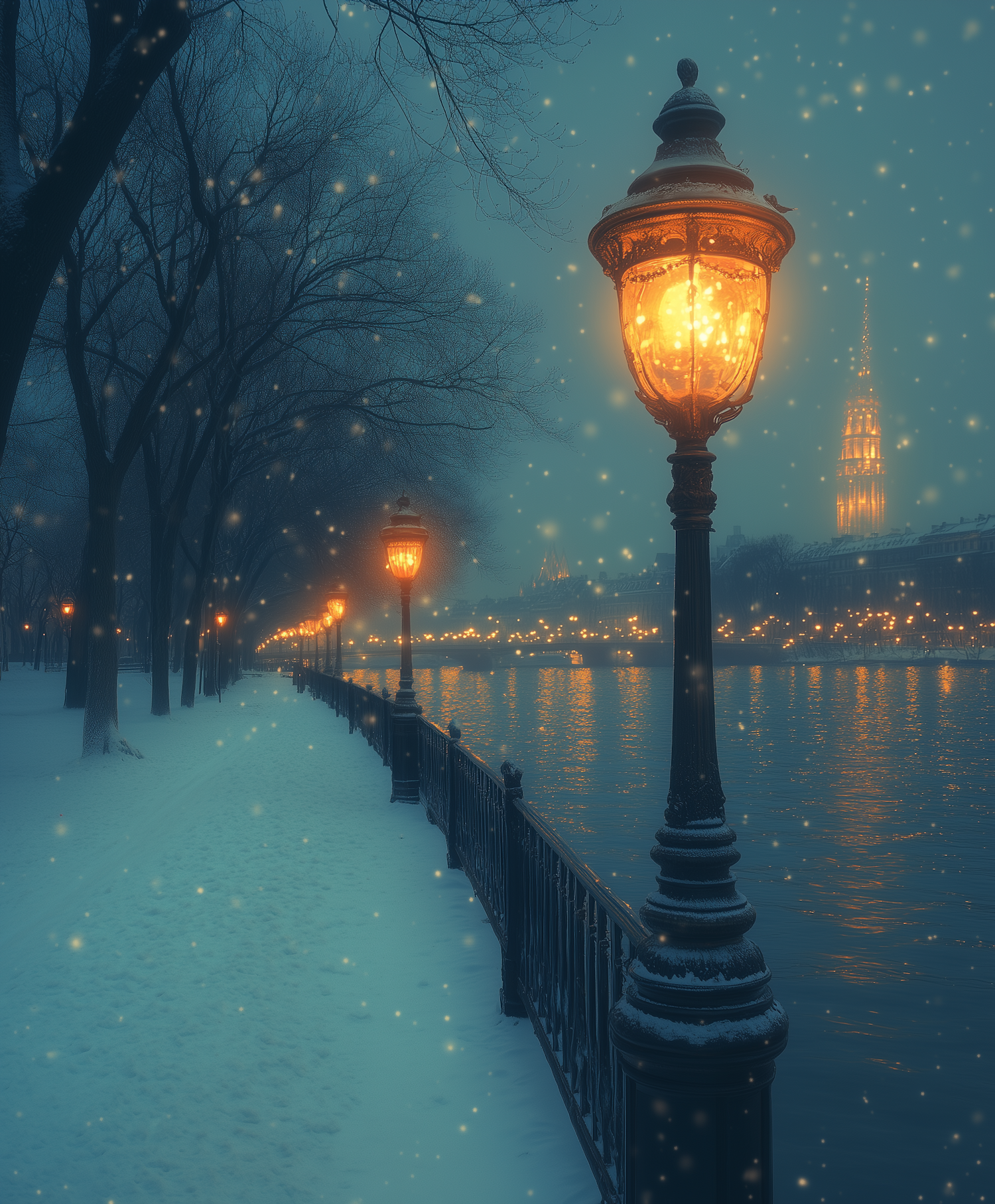 Enchanting winter scene with glowing street lamps, snow-covered path, and a distant illuminated spire by a tranquil river.