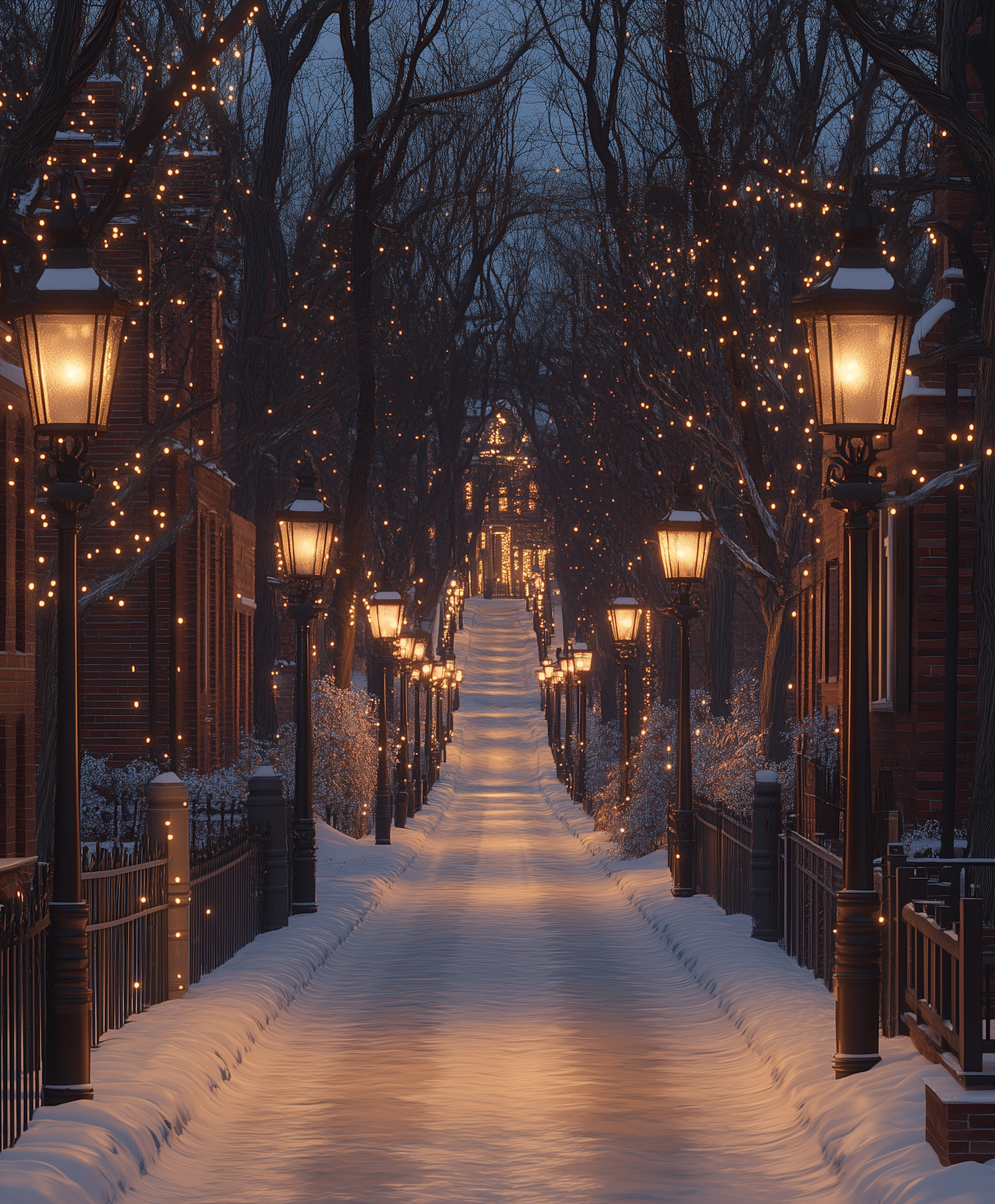 Enchanting winter street with snow, vintage lamps, and twinkling lights creating a festive, serene atmosphere.