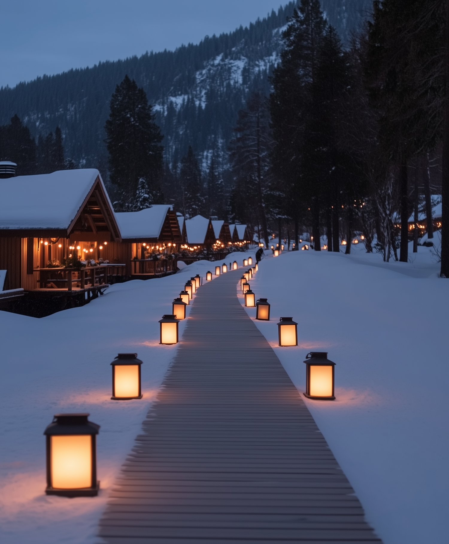 Snowy pathway lined with glowing lanterns, leading to cozy wooden cabins under a dusky sky and surrounded by mountains.