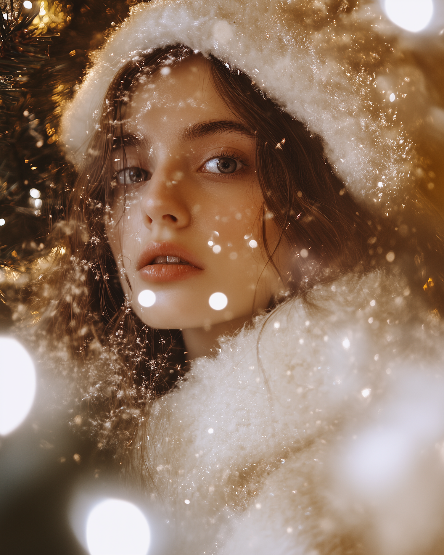 Close-up of a woman in a fluffy white hat with snowflakes and warm bokeh lights, creating a festive winter atmosphere.